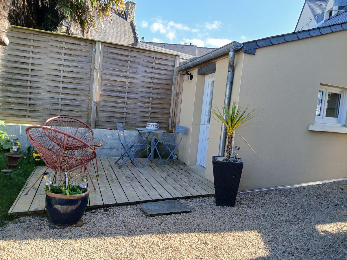 Studio attenant à jolie maison Bretonne avec terrasse Il se compose d'un espace salon, coin cuisine ainsi que d'une salle d'eau (douche et toilettes) au rez de chaussé. La grande chambre à l'étage est accessible par un escalier. Elle est composée d'un lit de dimension 160x200, rangements, petit canapé et TV. Espace extérieur accessible avec mise à disposition d'un salon de jardin.