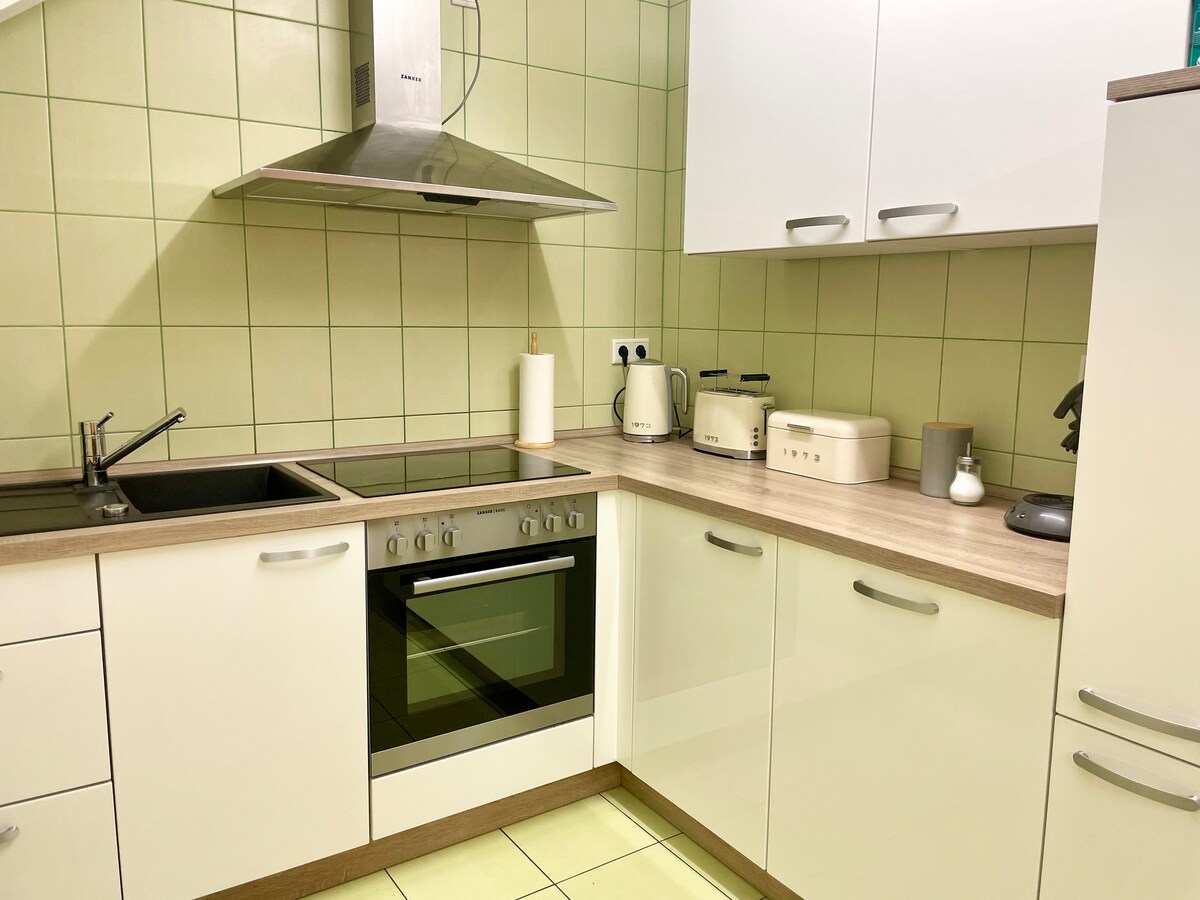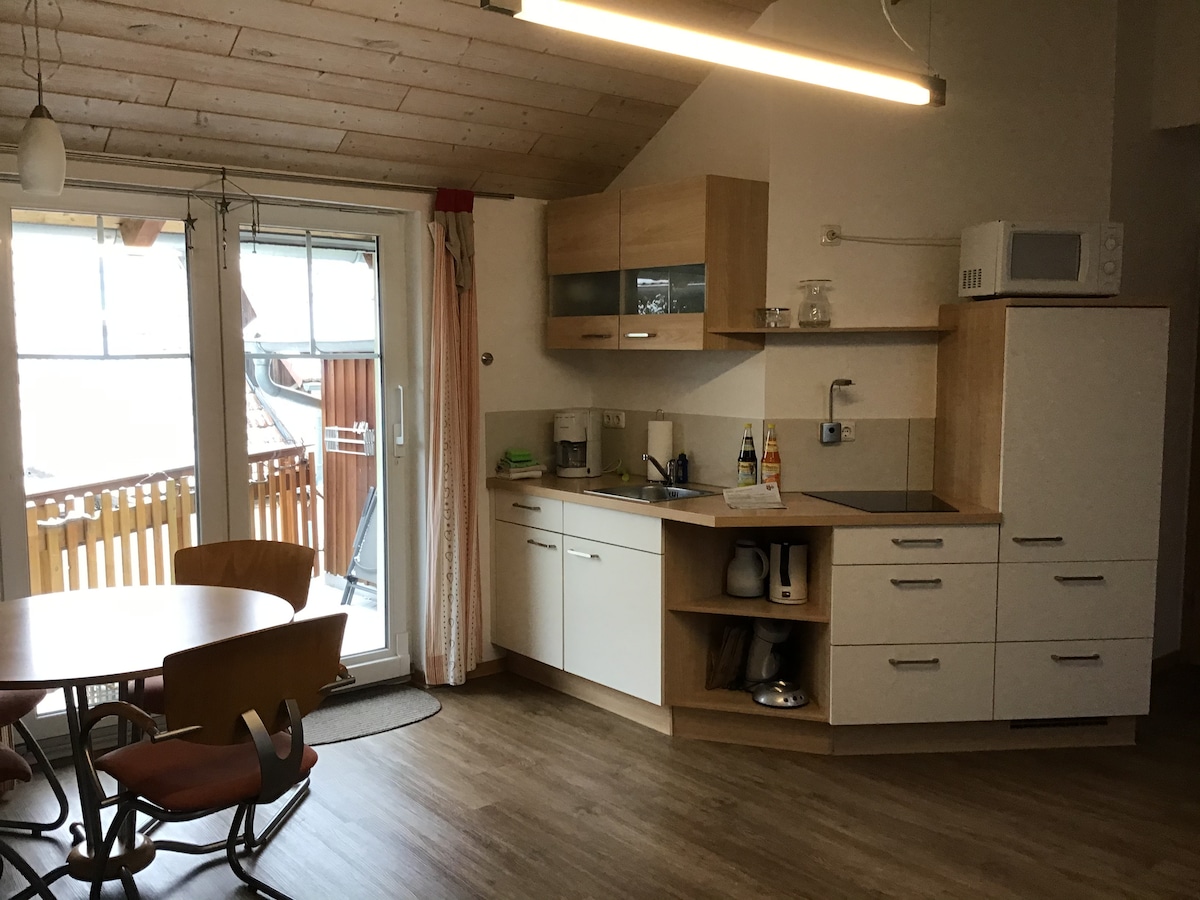 Sa unang palapag ay ang apartment na "Korbhaus". Sa humigit - kumulang 60 metro kuwadrado, mayroon kang dalawang magkahiwalay na kuwarto (double bed bawat isa), sala, kusina na may dining area at banyong may shower/WC. May kahoy na hagdanan papunta sa apartment. Inaanyayahan ka rin ng front porch na magtagal. Dahil ang basement ay ginagamit lamang bilang isang utility room, nakatira ka nang mag - isa sa bahay - nang hindi apektado ng iba pang mga holidaymakers sa parehong bahay.