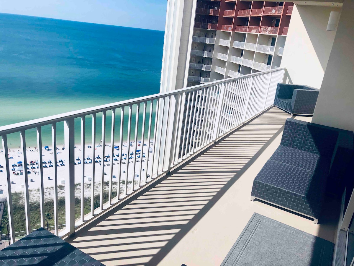 Gulf-front 16th floor Tidewater condo with beautiful ocean views from the balcony. This 2BR + bunk room layout sleeps 8 and is ideal for families and groups. Features include 3 full bathrooms, King suite, Queen bedroom, bunk nook, pullout sofa, fast WiFi, 70” smart TV, washer/dryer, and a fully stocked kitchen. Easy beach access, walk to Pier Park, and resort amenities including pools, hot tubs, dining, and Starbucks. Clear check-in guidance provided, including tips to avoid busy elevator times.