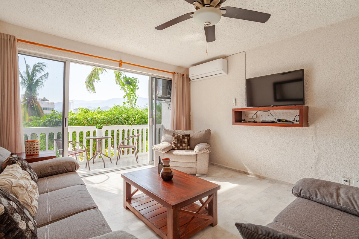 El depto (50m2) es parte de un condominio mediano, en el Fracc. Las Playas. A 5 minutos en coche del Club de Yates y de la Playa de Caleta. Con vista panorámica; tranquilo y seguro. Tiene 1 habitacion con una Kingsize y en la sala con una cama individual y dos colchonetas. Tenemos cocina y comedor. La terraza y la alberca son de área común. Notas: 1. No tenemos aire acondicionado, pero ventiladores sí 2. Antes de reservar revisa muy bien si la ubicación es idónea para ti.
