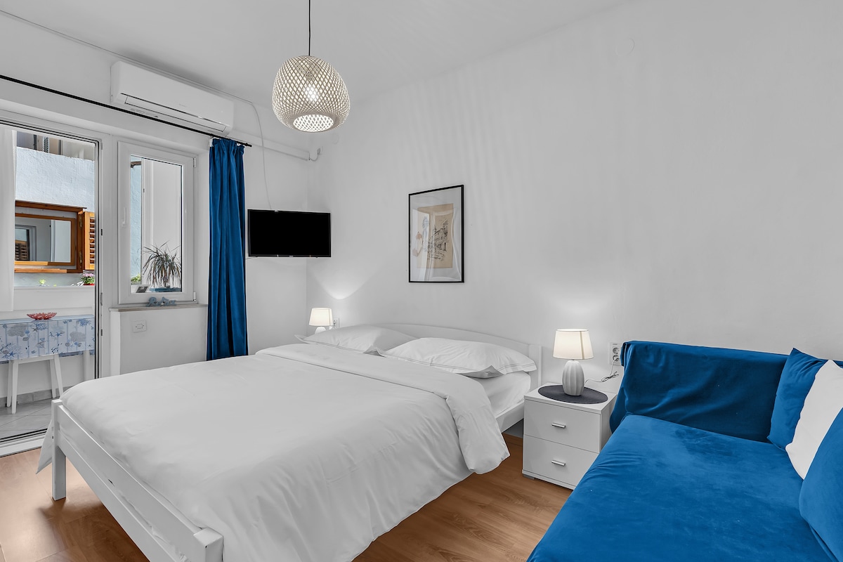 It is the apartment - studio 18 m2 on the third floor, which is the room with the french bed , bathroom, mini kitchen with eating place, sat tv, wifi, essentials, airconditioning, balkony facing the sea, free parking place The distance to the old place is 150 meters, to the the sea - lungomare, market, main square, restorants, caffes, discos , church, banks, harbour, markets 200 - 250 meters, bus station 250 meters, the beaches 450 meters, eskursions to islands Brač and Hvar possible.