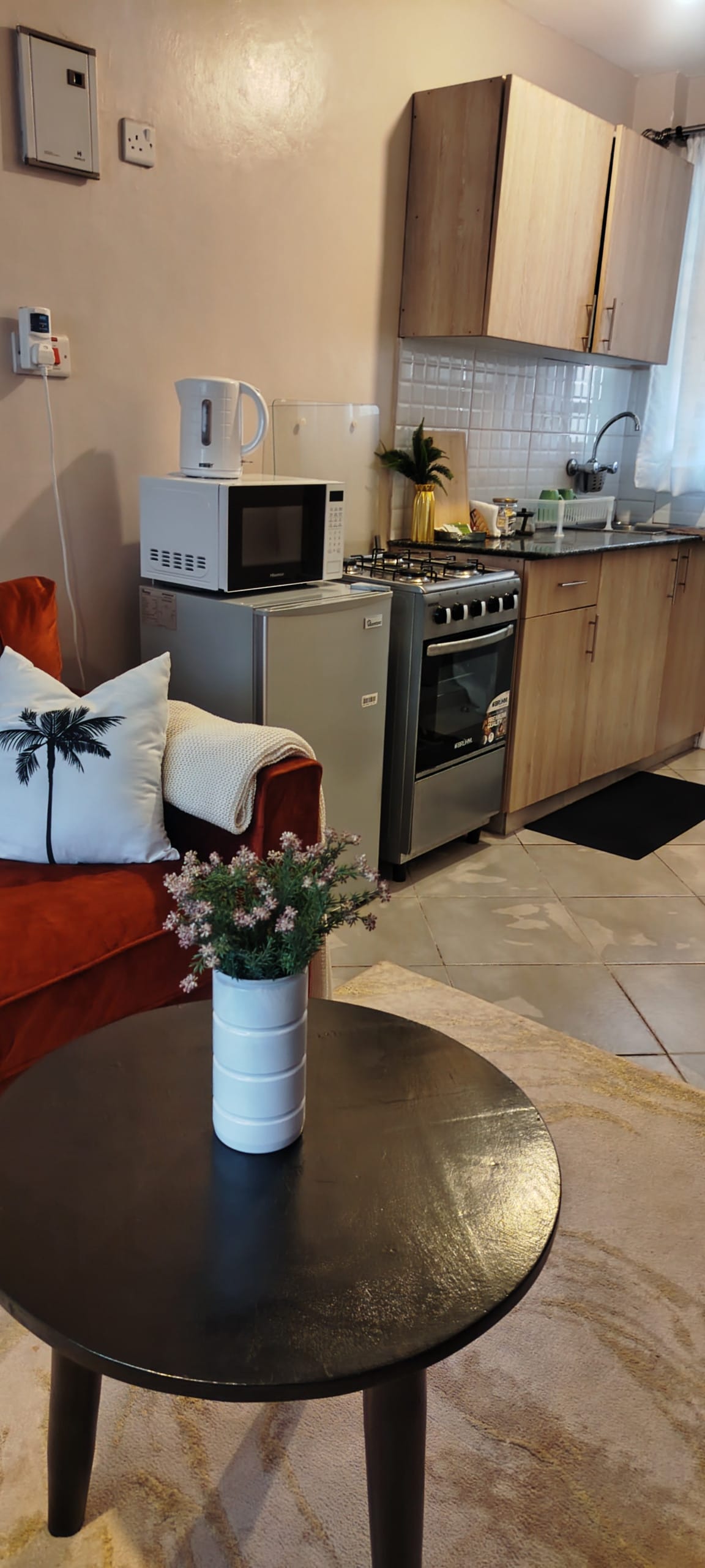Karibu to your bright open-layout cozy studio apartment perfect for layovers or long stays. Just 8.7km from JKIA, 3.9km from SGR, 3.3km to the Expressway linking to Westlands 19km away (toll charges apply), and 1.8km to Gateway Mall. It's safe to check-in even late in the night with 24/7 security, elevator and keypad access. Features fast Wi-Fi, backup generator, queen bed, workspace, modern kitchen, free gym and pool access and complimentary housekeeping. Enjoy our Kenyan coffee and tea.
