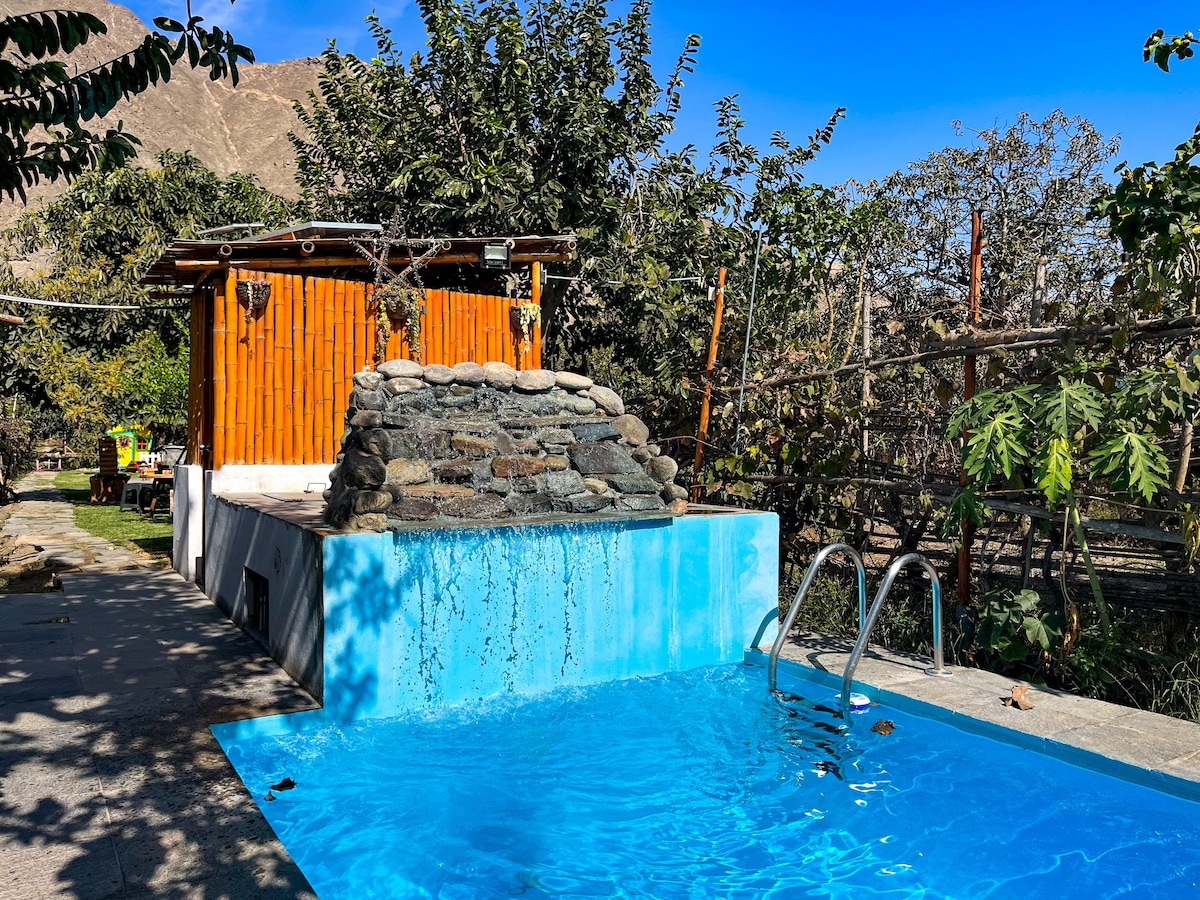 Matatagpuan ang bahay may 5 minuto ang layo mula sa Plaza de Armas de Lunahuana. Kami ay pet friendly at may 3 maluluwag na silid - tulugan, 2 kalinisan amenities, 3 panloob na stables, inayos na living - dining room, kusina na nilagyan ng kitchenette, halamanan na may mga duyan, armable pool, campfire area at grill area. Eksklusibo at tahimik na lugar, mainam na tangkilikin ang magandang hapon kasama ang pamilya at mga alagang hayop. Malapit sa mga ahensya ng turismo para sa pagsasanay ng extreme sports at access sa ilog 5 minuto sa pamamagitan ng kotse.