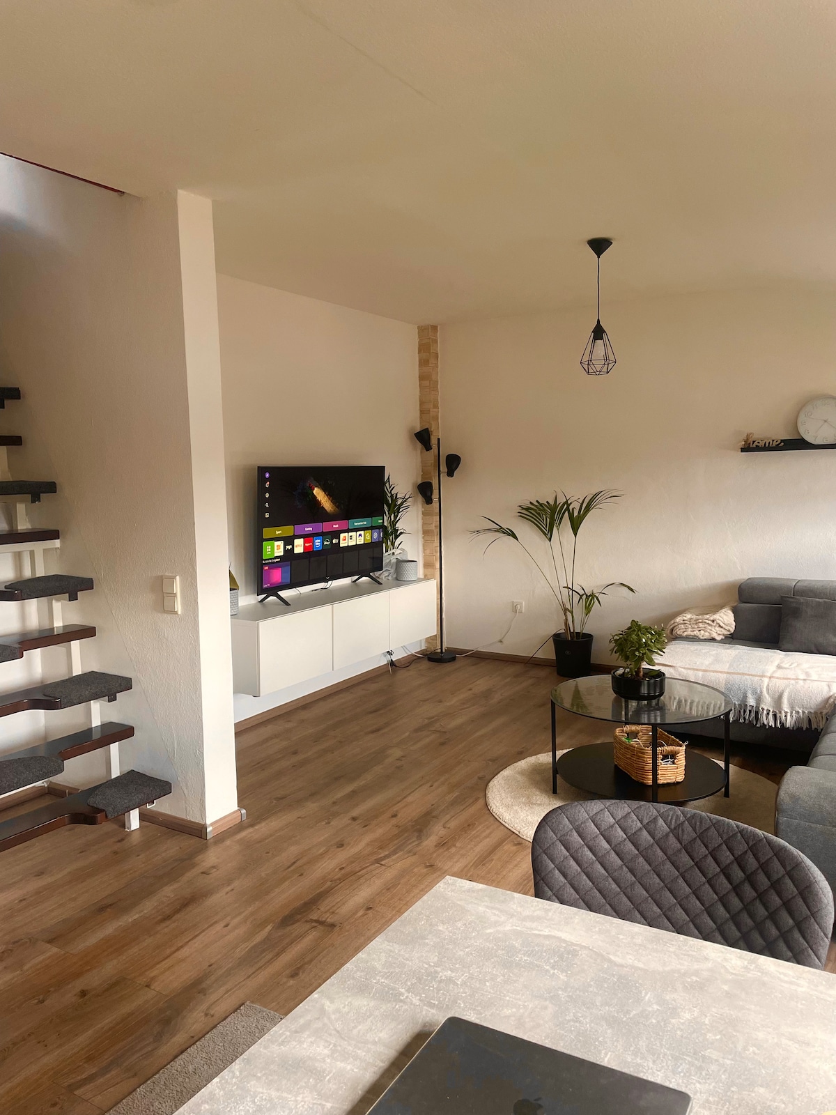 Spacious, bright and lovingly furnished apartment on the first floor with 2x bedrooms (king size box spring bed 1.80x2.0 and double bed 1.40x2.0), dressing table, kitchen with dining table, modern bathroom with shower and window, desk with a view of the... Green area, cloakroom, own entrance and parking space. WiFi/Smart TV. Perfect starting point for trips to Münsterland, Münster, Dortmund etc. The historic old town is 2 km away and offers shops, bars, cafes and the famous brine pool.