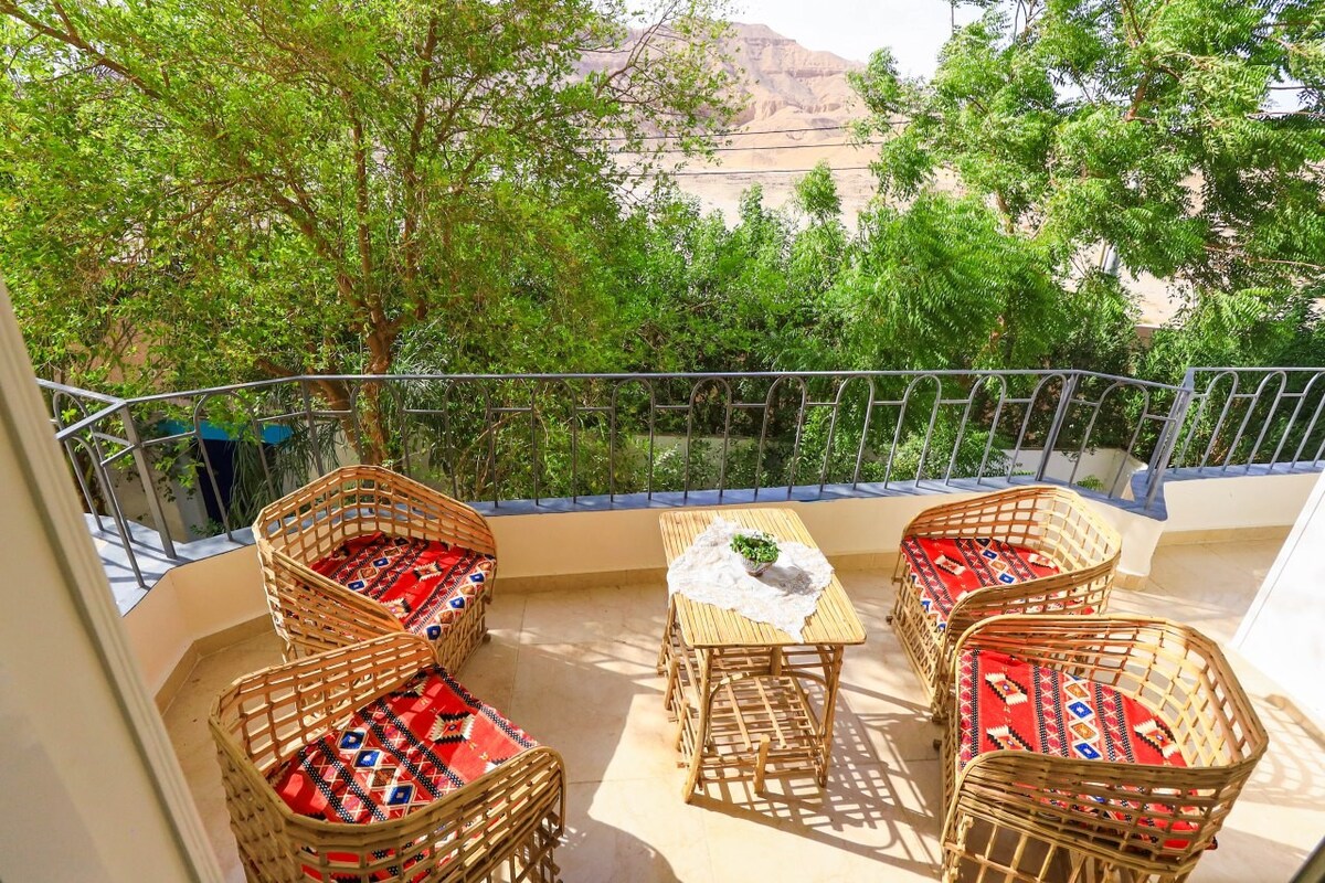 Halika at tamasahin ang maluwag at mapayapang pampamilyang tuluyan na ito na may magandang tanawin ng mga bundok na ilang hakbang lang ang layo mula sa mga pinakasikat na site ng Luxor! Gumising sa awit ng mga ibon at magkape sa umaga sa terrace habang pinapanood ang pagtaas ng mga hot air balloon sa ibabaw ng Valley of the Kings! Nag - aalok ang tuluyang ito ng maraming oportunidad para ma - enjoy ang maraming di - malilimutang umaga sa Luxor habang nag - aalok din ng perpektong lugar para magpahinga at mag - recharge.