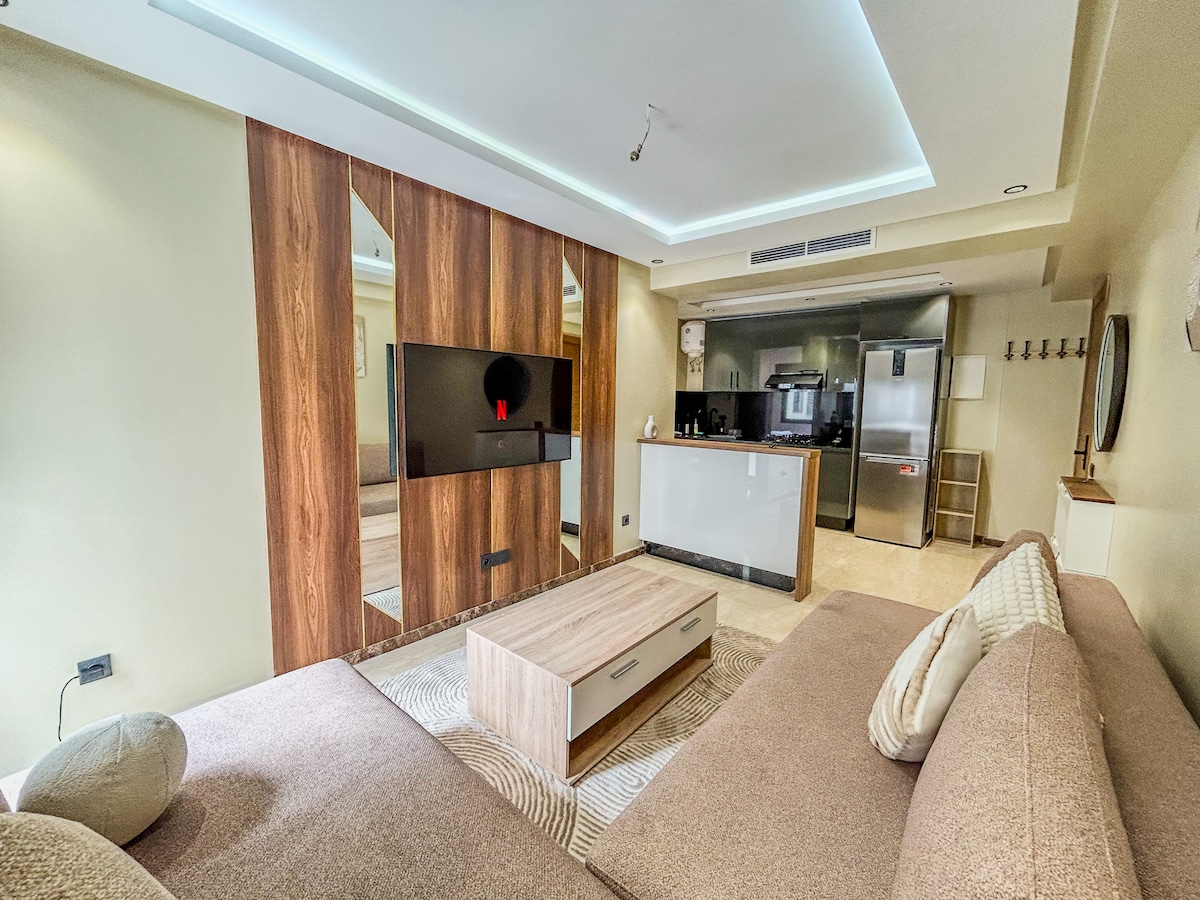 2 hakbang mula sa Twins Center, Luxury district Matatagpuan sa pinakasikat na pedestrian street ng Casablanca, sa tabi ng mga restawran nito, panaderya ng Amoud, mga tindahan ng Zara,Aldo Halika at tumuklas ng apartment na 60m2 kung saan magiging komportable ka sa lahat ng kaginhawaan na gusto mo. Bago ang tuluyan, kasama rito ang sala na kumpleto sa kagamitan na may American TV kitchen, toilet Master suite kabilang ang 60’TV room + bathtub ng banyo..at pribadong paradahan na 12m2