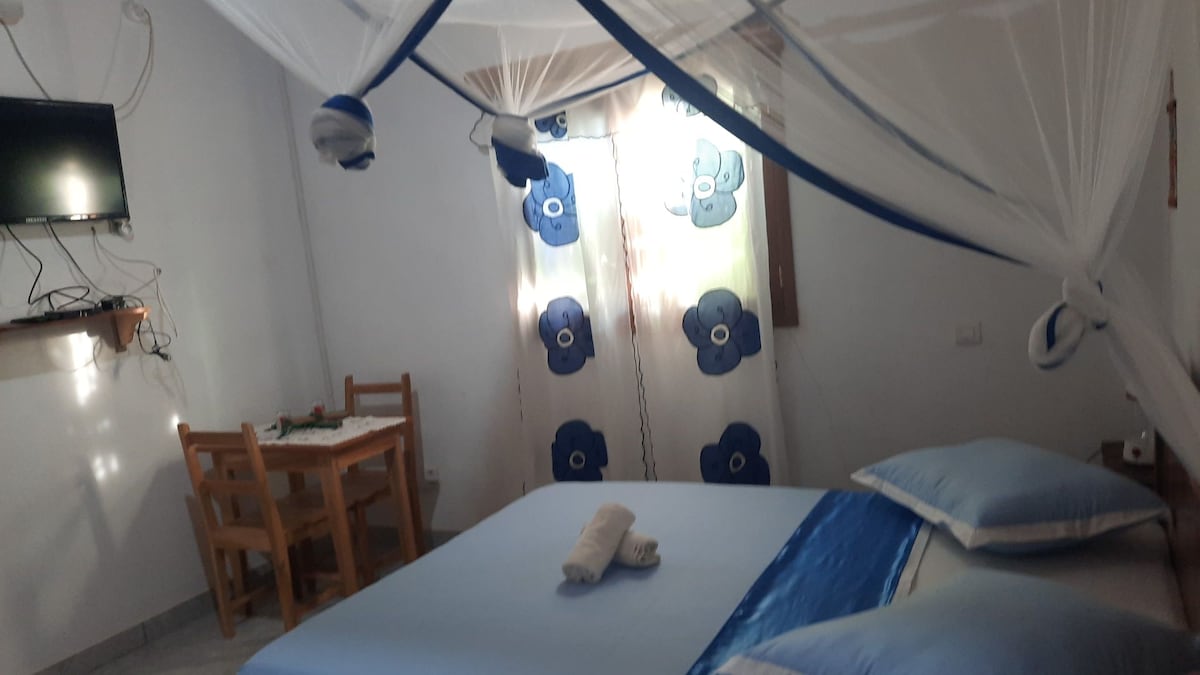 Charmant Studio au bord de mer avec chambre fermée, terrasse et cuisine, au sein d'une propriété familiale. Accès direct à la plage qui se situe en contre bas du jardin. idéal pour accès à toutes les activités : centre de plongée à proximité, centre équestre, départ de bateaux pour Nosy Sakatia, accès piscine naturelle de tortues en snorkeling. Prévoir véhicule pour accéder aux commodités (supermarché et restaurants à 20min Ambatoloaka).
