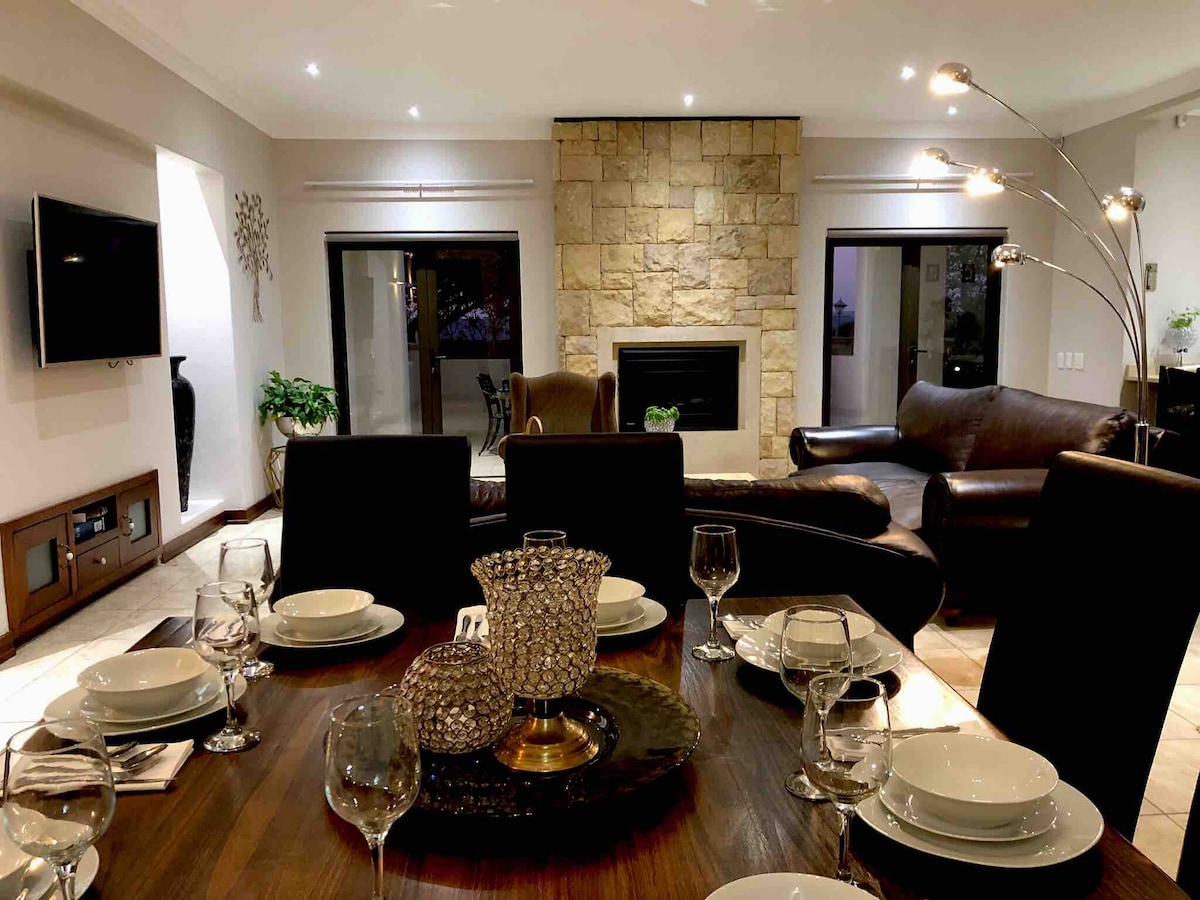 Matiwasay na setting na may mga nakamamanghang tanawin sa ibabaw ng mga bundok. Matatagpuan mga 70km mula sa Johannesburg at Pretoria. 100km mula sa Sun City, 130km mula sa Pilanes Berg at 40km mula sa Lanseria Airport. Nag - aalok ang lugar ng shopping, mga santuwaryo ng hayop, cable car, restawran, mga set ng pelikula, atbp. Nasa nature estate kami na may mga libreng roaming na hayop at fauna at flora na inaasahan sa naturang estate. Walang pinapahintulutang karagdagang bisita o araw. Posibilidad ng ingay mula sa resort, golf course at mga aktibidad sa gusali.