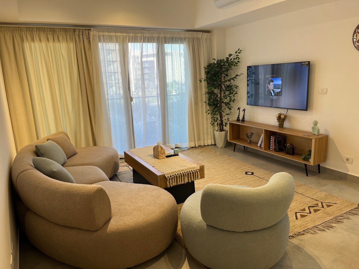 Step into a sun-soaked bohemian retreat where earthy tones, soft textures, and garden views create a sense of calm. This cozy, light-filled studio is perfect for couples or solo travelers seeking peace and comfort. Fully furnished with all essentials, and just minutes from shops and cafés. It’s your perfect space to relax, recharge, and soak in the serene, soulful vibe of Madinaty.