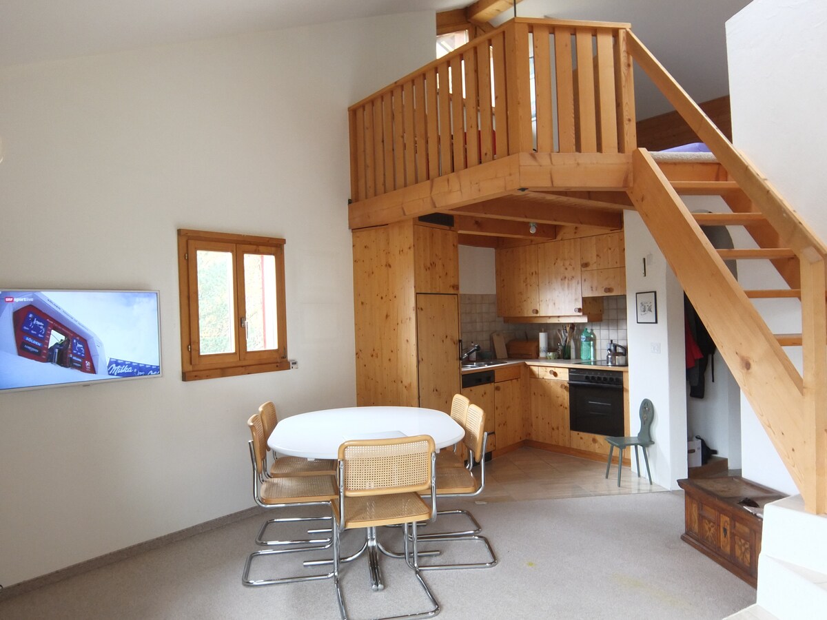 Magrelaks sa natatanging Rifugio na ito. Noong 2020, ganap na naayos ang 2 1/2 room apartment, na ang panloob na disenyo ay ganap na muling idinisenyo. Itinayo bilang isang loft na may pinakamasasarap na materyales (Valser Granit, castle parquet, maraming vintage wood, freestanding tub, iron fireplace na bukas sa dalawang panig, mga fixture ng disenyo). May protektadong pag - upo sa hardin at hardin. Maaraw, tahimik na lokasyon. Pribadong pasukan ng bahay, sauna sa annex. Mapupuntahan ang ski in, ski out o ski bus sa loob ng tatlong minuto.