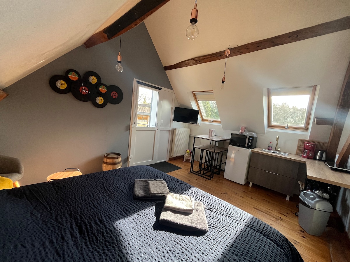Inaalok namin sa iyo ang pribadong tuluyan na ito sa loob ng aming farmhouse, ang tuluyan ay matatagpuan sa unang palapag ng aming tuluyan, magkakaroon ka ng pribadong access sa pamamagitan ng panlabas na hagdan, Sa labas ng ground floor, may mesa ng hardin para sa panahon ng tag - init. may paradahan sa harap ng bahay Ang access ay maaaring gawin nang nakapag - iisa salamat sa lockbox na ibinigay para sa layuning ito. Ang pag - check in ay mula 6pm hanggang 8pm (nang walang paunang pahintulot) Dapat gawin ang pag - check out bago lumipas ang 11 a.m.