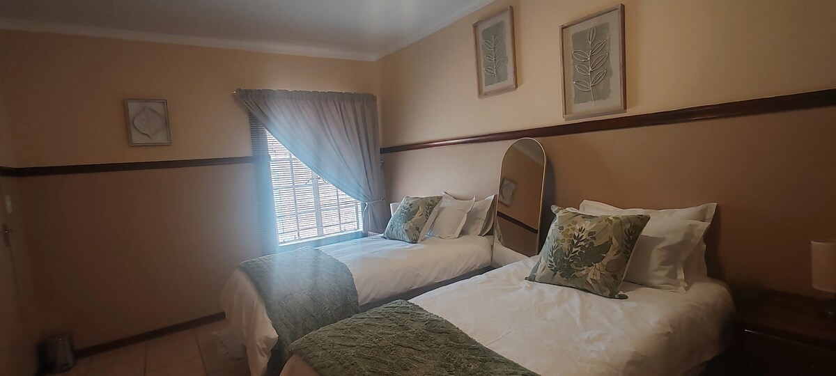 Bagong inayos na flat na may pribadong pasukan, libreng under - roof at aspalto na paradahan. Na - install kamakailan ang solar. Borehole water. Mainam para sa mga bata at alagang hayop. Pribadong braai area. Dalawang lugar ng trabaho. Mga koneksyon sa USB sa mga plug sa pader. Libreng wi - fi. TV na may Netflix. Hair dryer at iron. Queen size bed. Pribadong kusina na may air fryer, microwave, toaster, kettle at plunger, crockery at kubyertos. Talagang maluwang na banyo na may paliguan, shower, twin tub, bidet at panlabas na upuan.