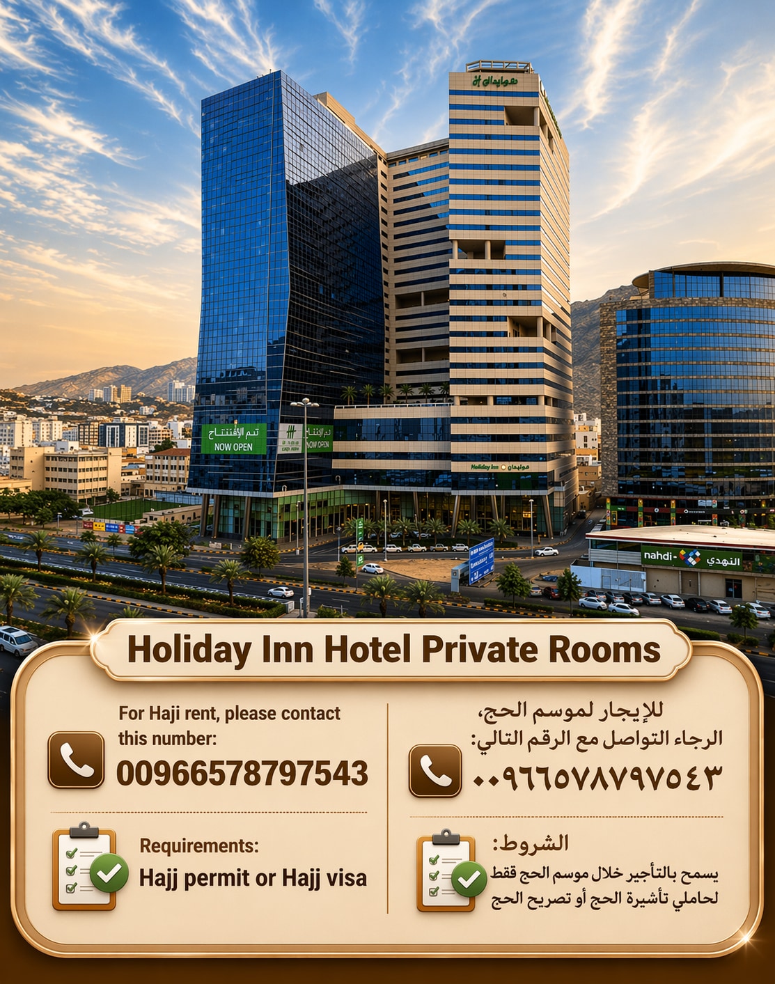Maligayang pagdating sa 5 - Star Holiday Inn Hotel sa Aziziyah – Malapit lang ang pangunahing lokasyon mula sa mga supermarket, cafe, at lahat ng iyong pang - araw - araw na pangangailangan Pinagsasama ng ➤ iyong pribado at eleganteng kuwarto ang modernong kaginhawaan sa tunay na hospitalidad. ★ 24/7 na Shuttle & Easy Access – Abutin ang Masjid Al Haram sa loob lamang ng 5 minuto sa pamamagitan ng taxi o 9 minuto sa pamamagitan ng mga LIBRENG shuttle bus na tumatakbo sa buong oras. ★ Malinis, Moderno at Pribado – Nakatalagang access sa palapag na may mga elevator, malinis na kuwarto, premium na kama at maayos na ilaw