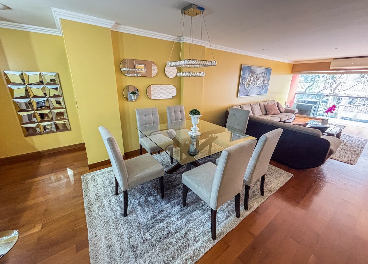 Moderno at maluwag na apartment sa Miraflores na may walang kapantay na lokasyon. Mayroon itong kusinang kumpleto sa kagamitan, smart Tv sa bawat kuwarto at sala, high speed internet na may mesh Wi - Fi, na matatagpuan sa ika -7 palapag na may mga tanawin ng karagatan at mga parke, ligtas na gusali w/doorman, elevator, at matatagpuan ito sa isang tahimik na kalye na may mga anti - noise window na naka - install sa kabuuan! Maigsing lakad ang apartment papunta sa karagatan, mga parke , mga restawran at mga bar. Nakuha na nito ang lahat ng maaaring kailanganin mo para sa mahaba o maikling pamamalagi!