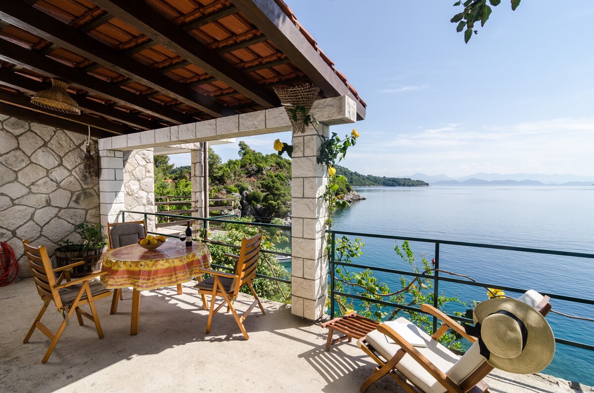 Little house, just near the sea with a beautiful view, located 30 km west of Dubrovnik and 5 km east of Slano. House is isolated, far away from the city and people, surrounded by green rose-mari es, blue sea and blue white sky. Mediterranean atmosphere scents of plants and the colors of environment. Private parking place near Adriatic road, first shop, restaurants. ..5 minutes driving by car in Slano.