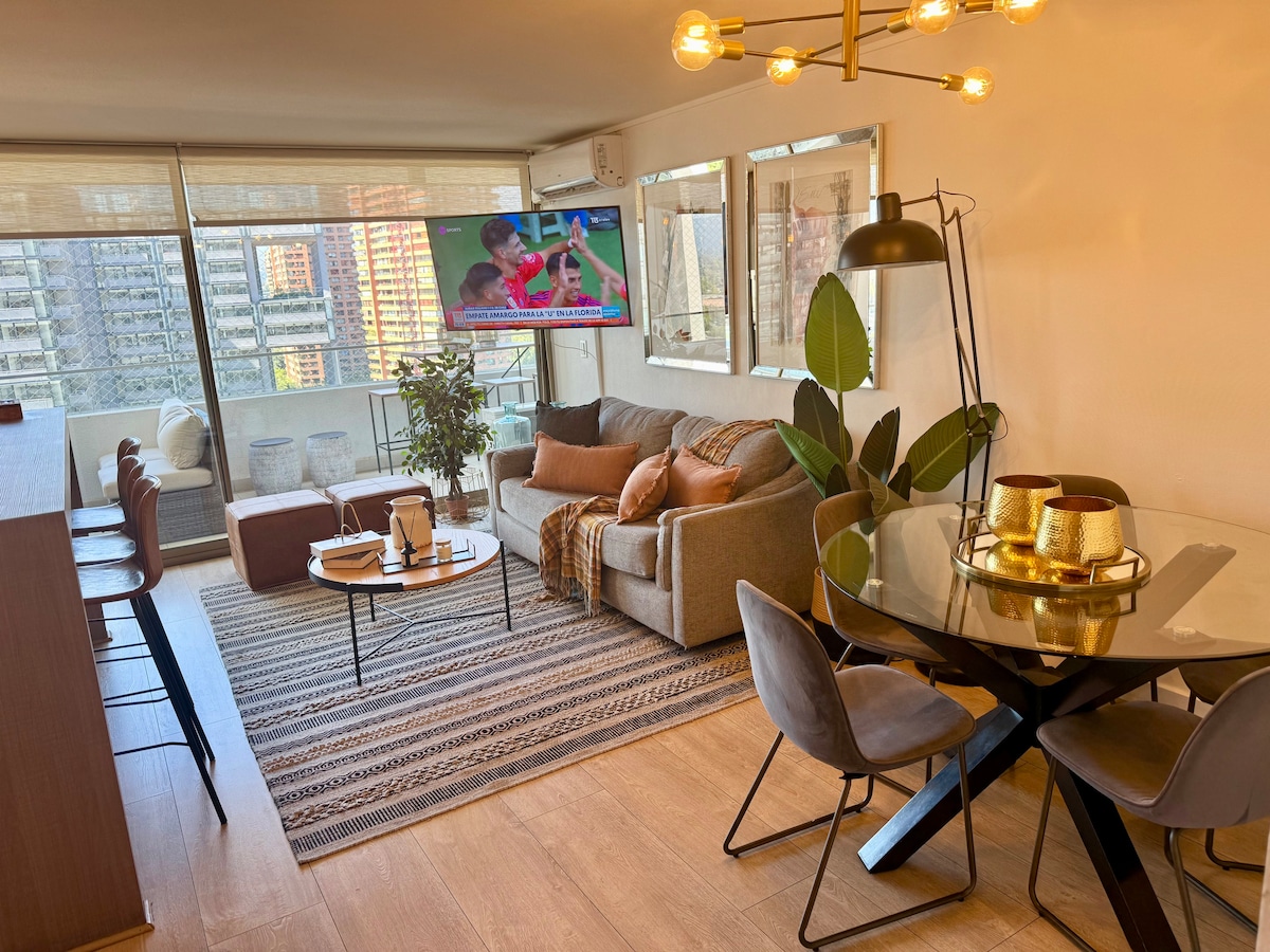 Bagong apartment, na matatagpuan sa isa sa mga pinaka - eksklusibong lugar sa Metropolitan Region. Mga hakbang mula sa Parque Araucano, isa sa mga pangunahing berdeng lugar ng Las Condes, ang sektor ng pananalapi ng Nueva Las Condes, pati na rin ang Mall Parque Arauco, Open mall, Bangko, supermarket, patios ng pagkain at German Clinic. Nilagyan ang apartment ng lahat ng kailangan para sa isang mahusay na pamamalagi. Mayroon itong king - size bed, sofa bed, double curtains, 55”TV, Nespresso coffee maker, dishwasher at iba pa.