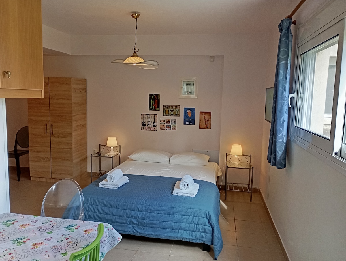 Mag-enjoy at mag-relax sa cool na kuwartong ito. Ito ay isang nakataas na basement na may sukat na 35 sq.m. Kailangan mong bumaba ng 4 na hakbang para makapasok sa apartment. Mag-enjoy sa common lobby sa paglalaro ng ping pong o retro games sa console. Pumili ng libro sa library para mag-relax. Ang mababaw na baybayin ng Iliadou, na 600 metro ang layo mula sa bahay, ay perpekto para sa ligtas na paglangoy. Mayroon kang maraming pagpipilian para sa kape, ouzo at pagkain at napakalapit!