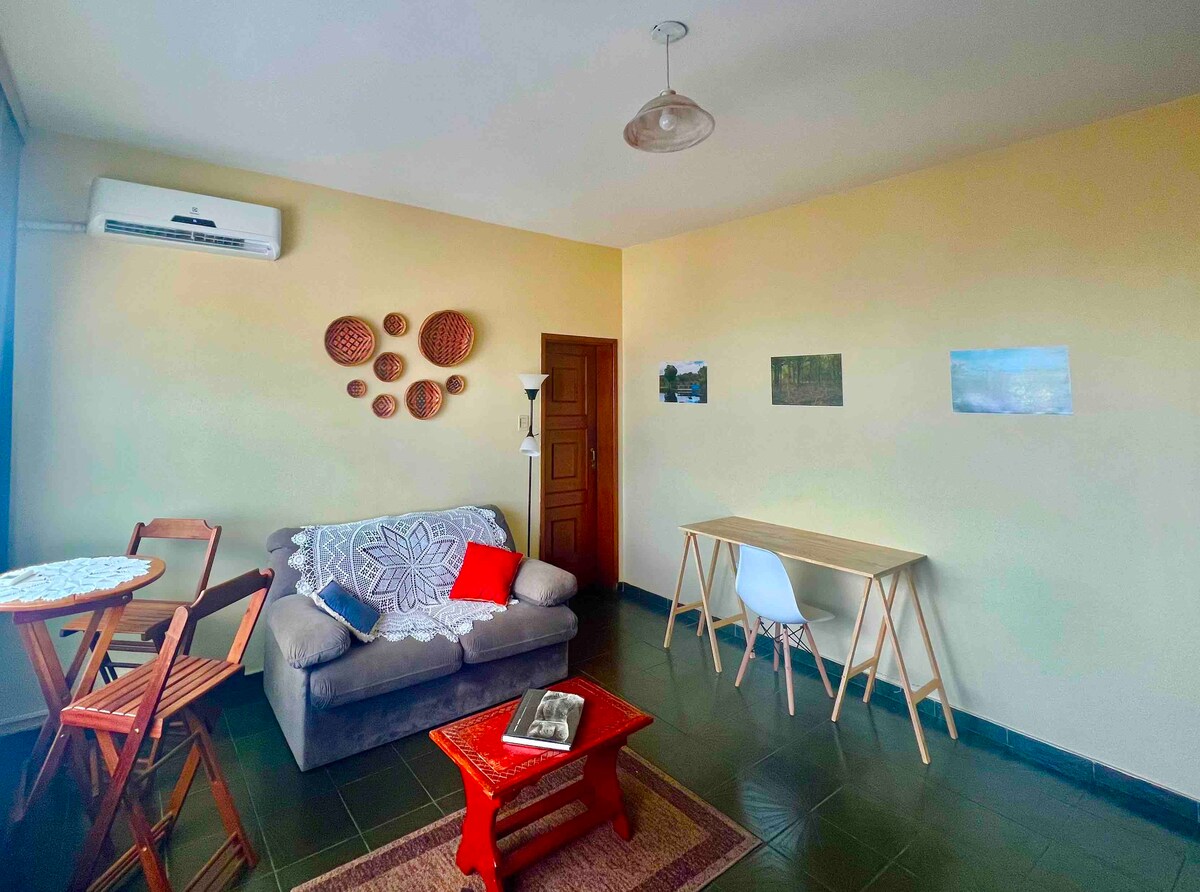 Ang natatanging lugar na ito ay may sariling estilo na nakaharap sa kagubatan. Manatili sa isang gitnang lugar na may pakiramdam na nasa tahimik at berdeng lugar at malapit sa mga pangunahing atraksyong panturista sa Manaus. Apartment sa isang mataas na palapag na may malawak na tanawin ng lungsod. Tangkilikin ang maginhawang lugar na may internet, double bed, desk para sa trabaho, magandang balkonahe at may natatanging dekorasyon na magbibigay sa iyo ng biyahe sa buong mundo nang hindi umaalis ng bahay.