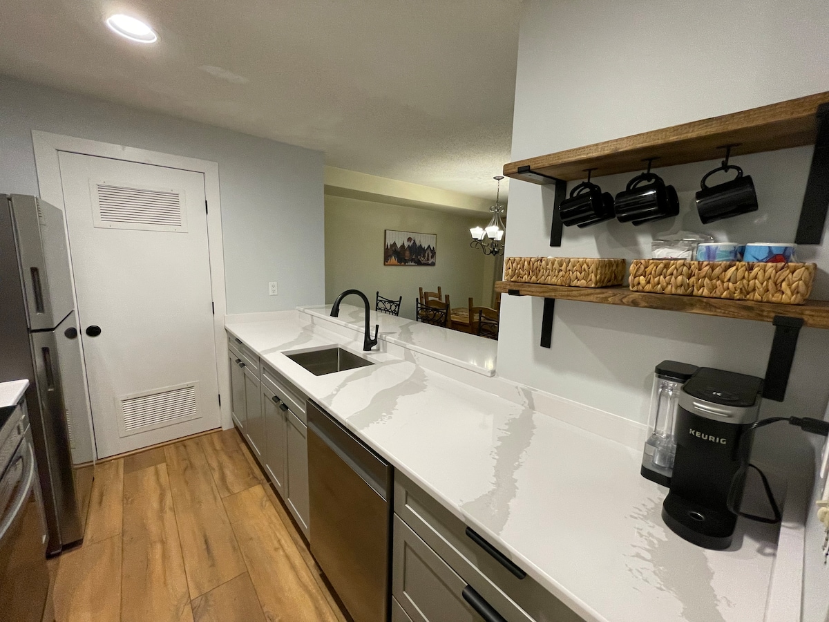 The Handle Lodge at Snowtree Condos is a modern 1BR condo at the base area of Mount Snow. Comfortably sleeps 6 adults and is fully equipped with everything you'll need for a fun getaway with friends and family. Make a meal in the beautiful kitchen or step out on the balcony for stunning mountain views. Our modern and cozy decor, the lovely views, and proximity to the mountain make it a great place to relax and recharge.