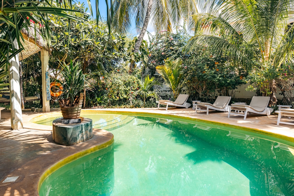 Ang aming bahay ay isang maliit na boutique hotel na may pool sa isang malinis na beach. Ang bahay ay napaka - istilong nilagyan ng isang halo ng moderno at African art. Maaari mong tamasahin ang tanawin sa isang beach bed sa harap o retreat sa isang kama sa tabi ng pool. Mayroon kaming maraming lounge spot, seating at dining area at terrace. Masiyahan sa mga bituin, araw, buwan, dagat at hangin na walang sapin. Tunay na ito ay tahanan na malayo sa bahay! Inaalagaan ng aming mainit na kawani ang mga bisita.