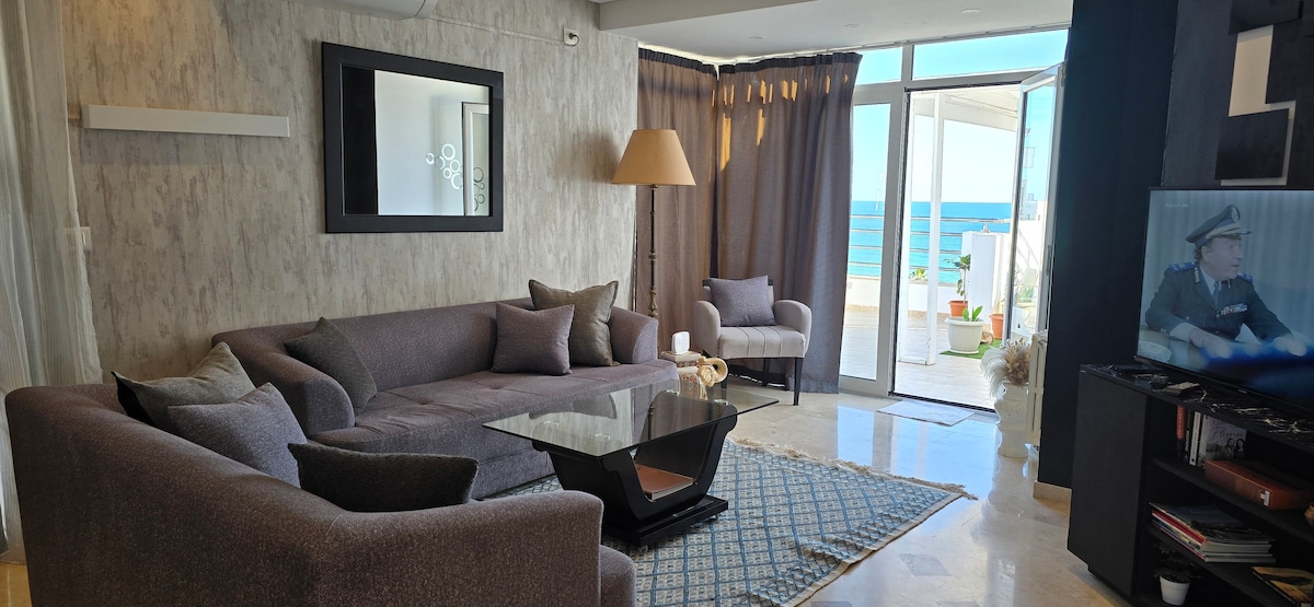 Discover a luxurious sea-view apartment in the city's heart. Wake up to Mediterranean panoramas from two bedrooms and enjoy coffee on a stunning terrace overlooking the coast. Located near The Medina and few minutes by taxi from Port El Kantaoui, this stylish space offers high-end furnishings, a well-equipped kitchen, WiFi, Smart TV, and modern comforts Two king-size bedrooms, an Italian-style bathroom, and workspace ensure a perfect urban retreat with easy access to cafés, restaurants, and bars