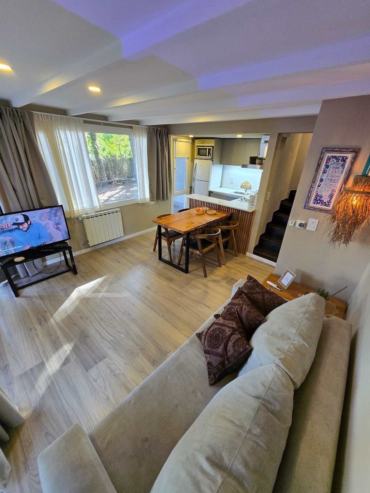 Apartment sa Mar de las Pampas na may upuan para sa 4 na pasahero. Dalawang kuwarto. 50 metro mula sa dagat at 600 metro mula sa shopping center. Matatagpuan sa ikalawang palapag kung saan matatanaw ang hardin . Mga Amenidad; - Living - dining room na may pinagsamang kusina, TV LED at Split Frio Calor, - Pinagsama - samang kusina na may breakfast bar, - Silid - tulugan na may double bed na may LCD at mainit na apoy, - Banyo na may whirlpool, - Balkonahe na may garden at grill set, - May kasamang mga linen, tuwalya at sapin,