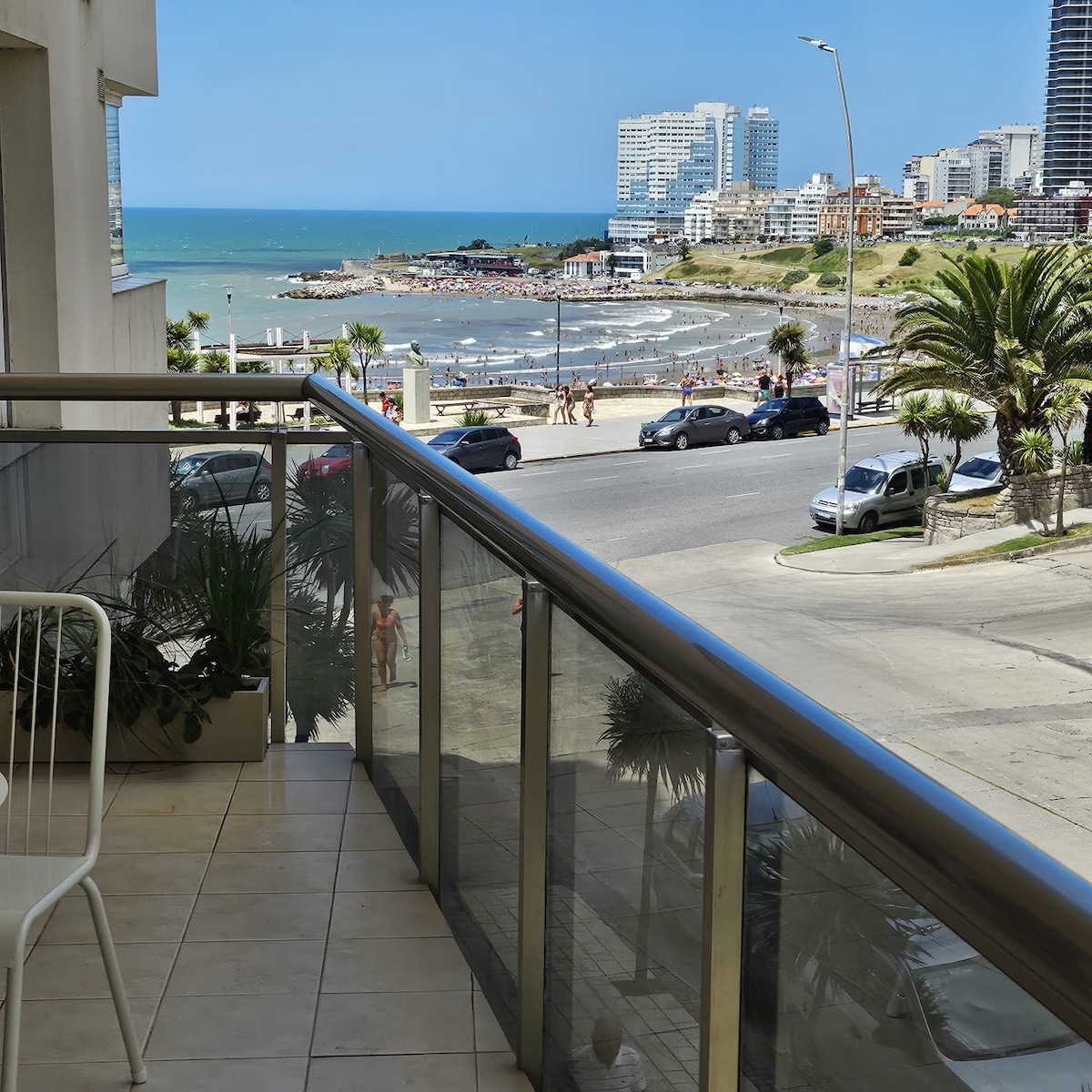 Apartment na may 3 kuwarto at 2 banyong en - suite. Zona Playa Grande, Mar Del Plata. May AC sa sala at bentilador sa mga kuwarto. Oceanfront at Gulf, napakalinaw at may magagandang tanawin mula sa mga kapaligiran nito. Garahe at 24 na oras na seguridad. Access sa gym at outdoor pool. Para sa mga bata, may playroom at mga laruan sa palaruan sa loob ng property. Mayroon itong SPA at KABUUAN (kapwa may naunang reserbasyon, depende sa availability, mga reserbasyon lang na mas matagal sa isang linggo). Buod na may dagdag na gastos. * HINDI KAMI TUMATANGGAP NG MGA GRUPO NG MGA KABATAAN*