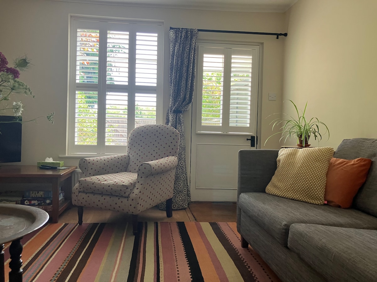 Quiet location. Easy to access from London by direct train or road. Private guest area with own fenced and gated garden. Ample off road parking. 15 min walk along footpath to train station and large supermarket. Garden centre, restaurant and public golf course on same road. Numerous high quality restaurants in this and nearby villages. WiFi TV with Amazon prime and Disney Plus guest access. Coffee pod machine, kettle and fridge. Breakfast of cereals, choice of milk type and fruit provided.
