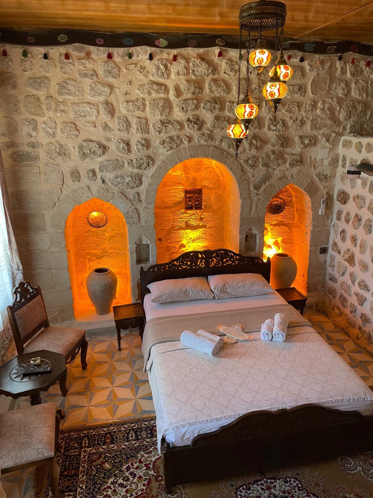 Sa aming kuwarto, na pinagsasama ang kamangha - manghang makasaysayang texture ng Mardin sa modernong kaginhawaan, isang hindi malilimutang karanasan sa tuluyan ang naghihintay sa iyo sa mahiwagang kapaligiran ng mga pader na bato. Bukod pa sa pagbibigay ng komportable at kasiya - siyang karanasan sa pamamalagi sa aming mga bisitang namamalagi sa aming pasilidad, nag - aalok din kami ng maingat na inihandang serbisyo sa almusal tuwing umaga na kasama sa presyo ng kuwarto. Hinihintay ka naming simulan ang araw sa pamamagitan ng masarap na almusal na puno ng mga sariwang produkto.