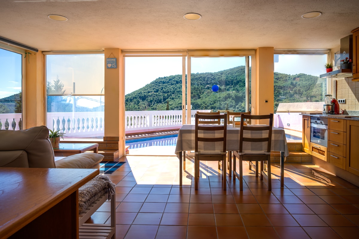 We offer you this 4-bedroom house for the exclusive use of our guests, where the sea and the mountain converge in a unique space. It is located in the natural park of Montnegre, only 10 minutes from the beach. It's also very well communicated with Barcelona, just 40 minutes by car! Swimming in the pool, barbecue, relax, dream views. The house has air-conditioning in three areas of the villa for the summer and central heating for the winter. ESFCTU00000811300035044900000000000000HUTB-063263-043