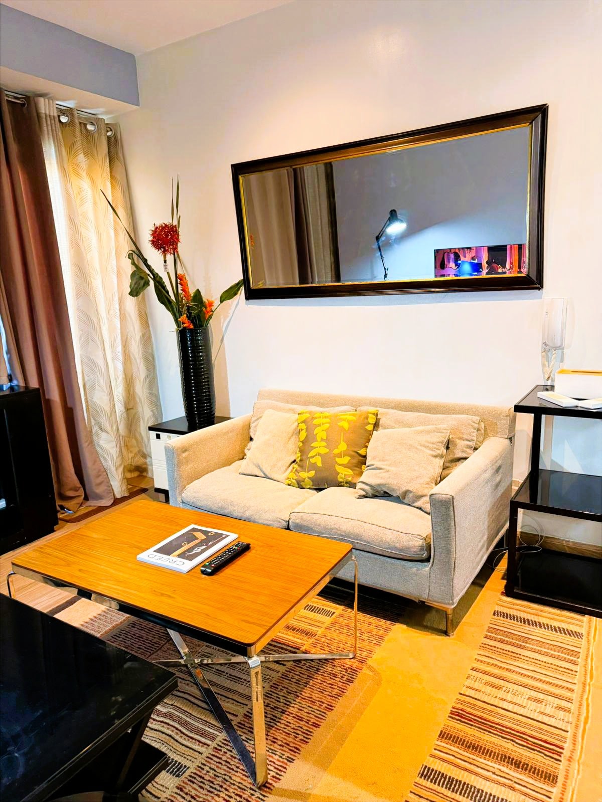 Luxurious Artsy 1 Bedroom unit. Walking distance to malls, 24hrs convenience stores, restaurants, groceries, and Lively Nightlife. โ 4k UHD TV + A/C + Workspace โ Netflix, Disney+, and Youtube access โ 400mbps upload and download speed! โ Board games are provided if you wanna have fun! โ fresh towels, and essentials provided โ Kitchenwares, cooking appliances, Microwave โ Coffee Machines โ Steam Iron, Hairdryer and Water Heater