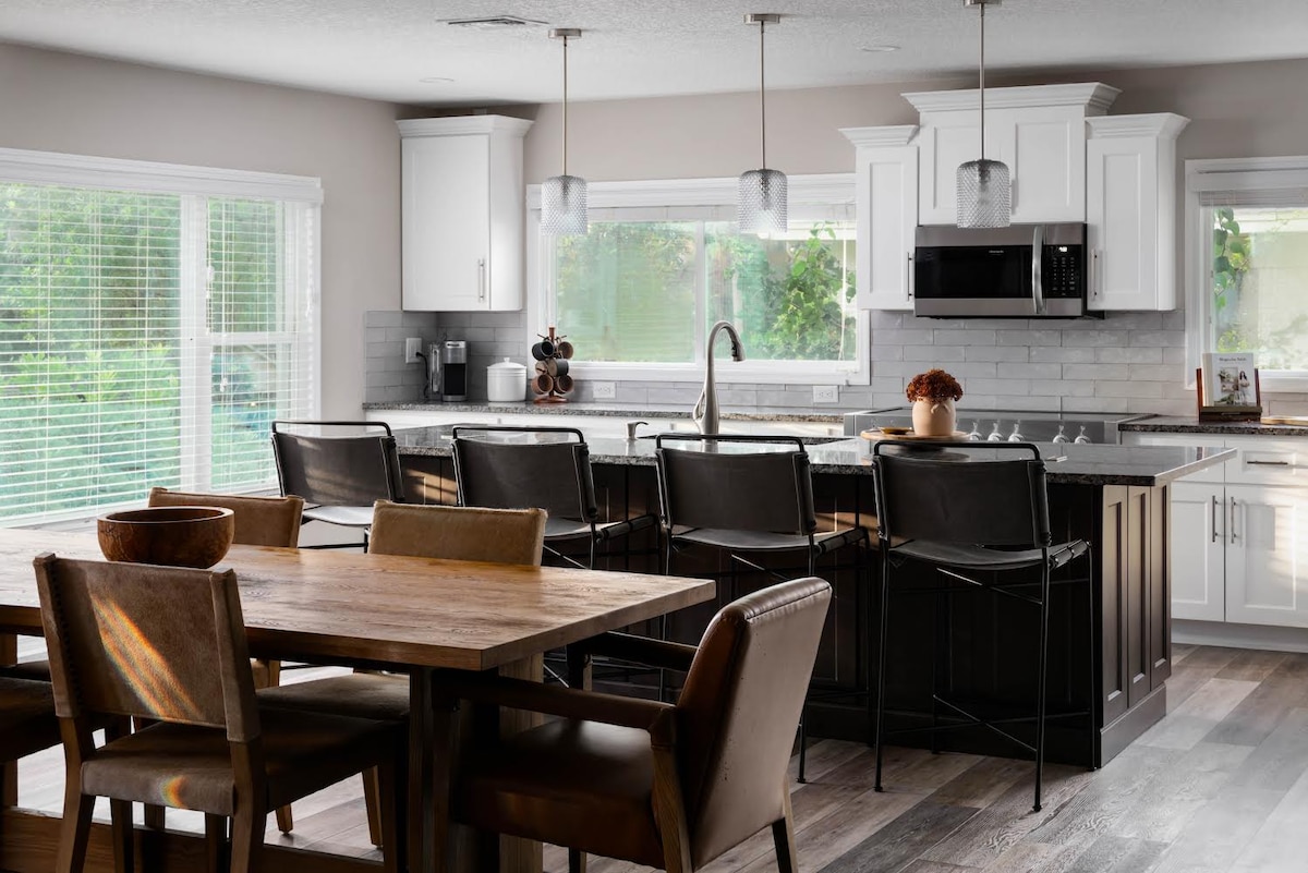 5 minuto mula sa World Equestrian Center, ang tuluyang ito ay nasa isang prestihiyosong komunidad na matatagpuan sa aming mga lokal na puno ng Live Oak. Pinagsasama ng natatanging property na ito ang lahat ng pinakamagandang iniaalok ng Ocala, ang kombinasyon ng bansa ng kabayo, mga kamangha - manghang paglubog ng araw at mga nangungunang amenidad. Masiyahan sa maluwang na bakuran sa likod - bahay w/ seating, fire pit, at marami pang iba. Ang 3 king bedroom, 3 banyo, 4 na portable na natitiklop na higaan, 2 sala, na may malaking kusina ay ginagawang komportableng pamamalagi sa isang kaaya - ayang tuluyan na may maraming aktibidad sa malapit