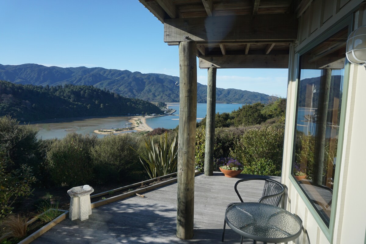 Isang magandang tuluyan sa isang nakamamanghang lokasyon kung saan matatanaw ang Marahau, Adele Island at Abel Tasman National Park. Itinayo gamit ang earth block at kahoy, ang tuluyang ito ay may mainit at kaaya - ayang karakter, na napapalibutan ng katutubong kagubatan, makakapagrelaks ka sa tunog ng mga Bell bird at Tuis. Ang master bedroom ay bubukas papunta sa isang pribadong patyo na nakaharap sa hilaga, upang makuha ang araw ng umaga at ang kasalukuyang tanawin ng National Park. Dalawang karagdagang silid - tulugan ang tanaw ang katutubong kagubatan, na lumilikha ng maraming espasyo para sa pamilya o mga bisita.