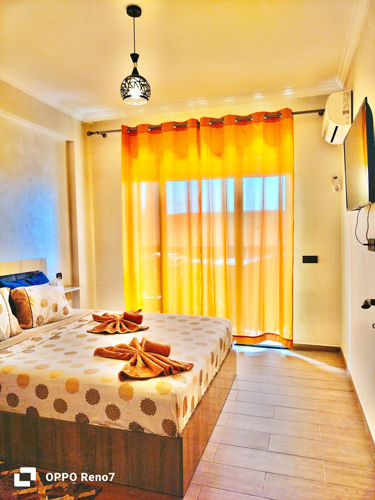 the apartment is close to everything, 7 min by car to the Menara mall, 12 min by car to Jamaa el-Fnaa, 5 min by car to the Airport, many restaurants, a pharmacy, a bank is 10 by car , 10 min by car to Mcdonald’s, Zara and Carre Eden Center Commercial, and any other directions is with an easy reach everything is close As soon as you enter, you'll be welcomed by an airy, open-concept living area featuring large windows that frame a stunning view of the lush garden.