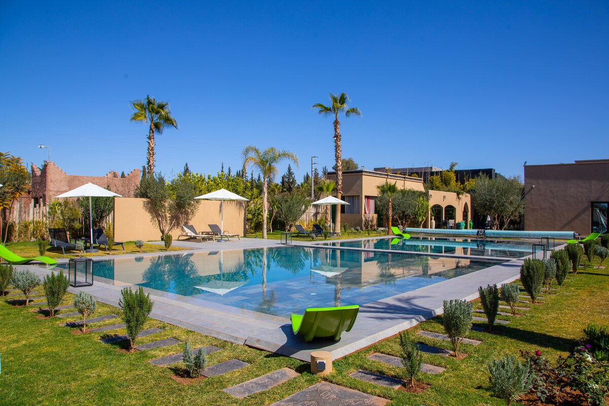 Tanawin ng Atlas Mountains ✨ Boutique Resort ✨ Welcome sa pribadong luxury bungalow mo sa eksklusibong resort na may lawak na 20,000m². Tangkilikin ang kapayapaan at privacy na may access sa mga pinaghahatiang marangyang pasilidad tulad ng mga pool, hardin at Jacuzzi. ✔ 2 malalawak na pool at malawak na hot tub ✔ Pang - araw - araw na housekeeping ✔ 15 minuto mula sa Medina at mga souk ✔ 20.000 m2 na Marangyang Hardin 🩶 Kung hindi na available ang listing na ito, magpadala sa amin ng mensahe. Nag - aalok kami ng maraming listing sa iisang site.