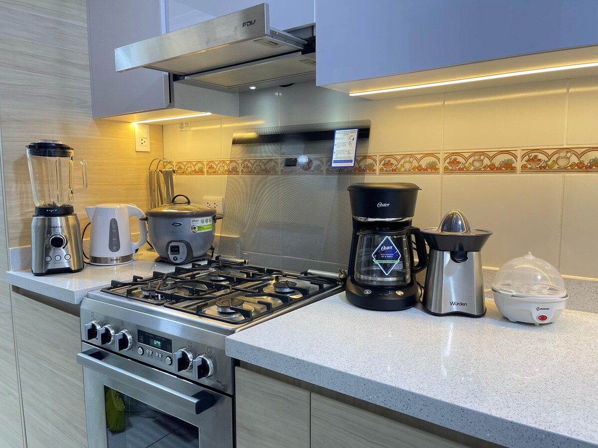 Ang departamento ng pagbubukas ay kumpletong nilagyan ng kailangan mo para sa mga panandaliang pamamalagi o pangmatagalang pamamalagi, 3 bloke mula sa Magic Circuit ng tubig, 2 bloke mula sa Av. Arequipa, at ilang minuto mula sa ospital ng Rebagliati. Mayroon itong: ✔️ Sala na may 55 "TV ✔️ Netflix at Disney. ✔️ 2 Kuwarto na may Queen Bed Kusina ✔️ na kumpleto ang kagamitan ✔️ Banyo na may Spanish Shower - Mainit na Tubig 🚘 Paradahan: S/ 20.00 (suriin ang availability) Maximum NA 4 NA tao, walang PAGPASOK NG MGA PAGBISITA