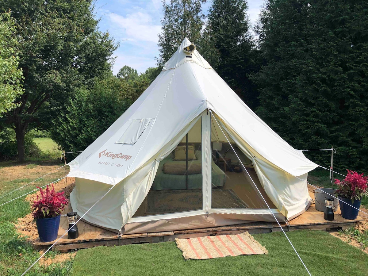 Salamat sa isa pang magandang taon! Hindi na gagamitin ang tolda. Maghanap ng bago at kahanga‑hangang gusali na darating ngayong tagsibol! Magpahinga at mag - recharge sa magandang tanawin ng glamping retreat na ito. Masiyahan sa mga tahimik na sandali ng zen sa meditation garden, gisingin ang mga ibon at paruparo, lumutang sa hapon sa pool o mag - enjoy sa pagniningning sa hot tub sa gabi. Naka - set up kami para sa tahimik na bakasyunan para sa 2 tao. Dapat maaprubahan nang maaga ang mga karagdagang bisita. Walang party!
