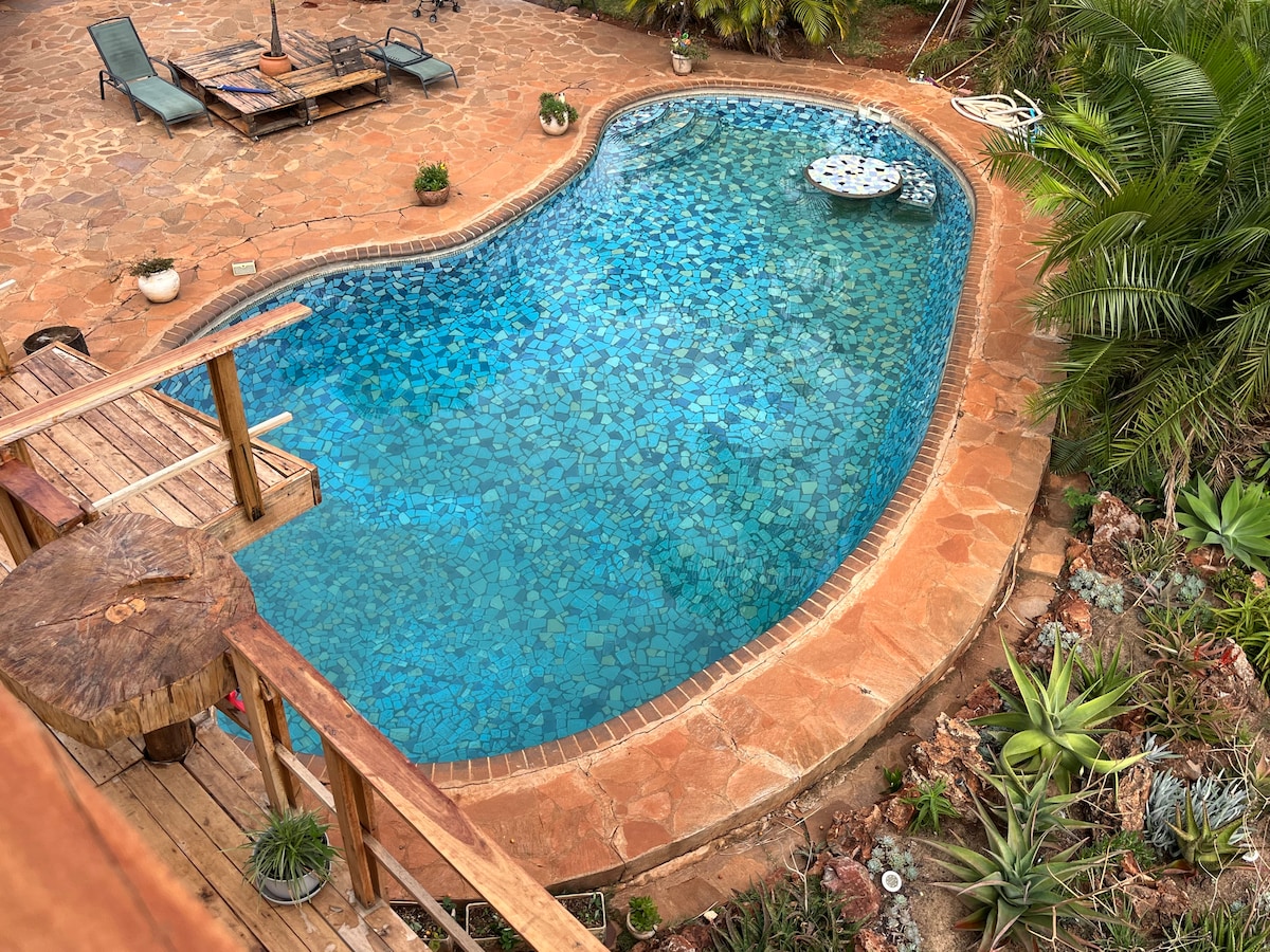Modernong rustic na cottage na may dalawang kuwarto at bubong na gawa sa anay na napapaligiran ng mga natural at landscaped na hardin. Perpekto para sa isang mapayapang bakasyunan kasama ang pamilya, mga kaibigan o kahit na isang solong biyahe. 6 na kilometro lang ang layo mula sa sentro ng Harare. Mayroon kaming mabilis na internet, Apple TV, mainit na tubig na pinapainit ng gas, mahusay na solar backup, swimming pool, kusinang kumpleto sa gamit na may gas at de‑kuryenteng kalan, dishwasher, atbp. Mayroon kaming 2016 Nissan Xtrail 4x4 na available para sa pag-upa (tingnan ang mga larawan) at isang dagdag na Starlink na maaari ding iupahan