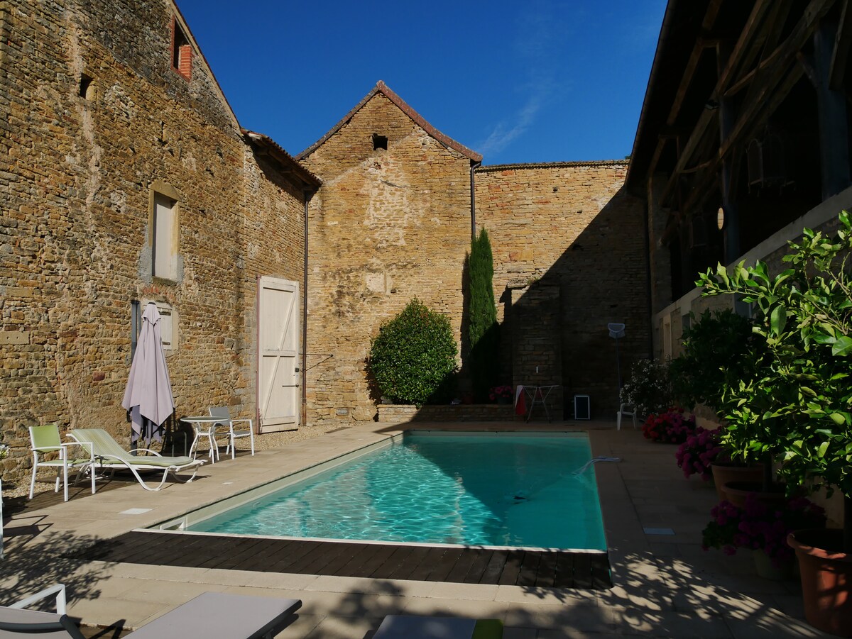 TARIFS INCHANGÉS pour 2026 et ce depuis 4 ans. Sud Bourgogne, proche Cluny, très belle maison vigneronne et sa dépendance le tout dans une cour fermée et intime. Terrasse de plein pied. Idéal pour les courses ou les personnes à mobilité réduite, Le calme absolu sans être isolé. Gare TGV de Mâcon à 15'. Pour épicuriens appréciant le bon vin et la bonne chère en plein coeur de la bourgogne méridionale.