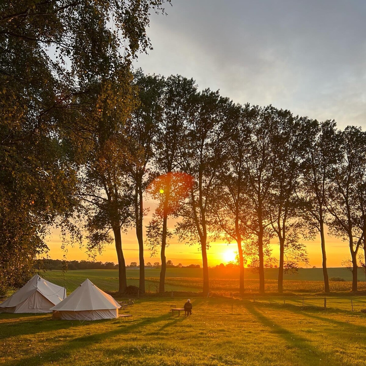 Mga tent sa wild perennial garden at may mga walang katulad na tanawin sa malayo. Sa pagitan ng mga damo na binabato ng hangin at napapalibutan ng maraming lawa ang nakatayo sa aming 5000 sqm na ari - arian, na matatagpuan tulad ng isang isla sa gitna ng mga bukid, isang tolda na may 30 metro kuwadrado na gawa sa magaspang na koton. Ang tatlong puno ay nagbibigay ng lilim at kanlungan sa likod, habang ang tolda ay bubukas sa kanluran para sa mga tanawin ng paglubog ng araw, at crane at Milan pass.