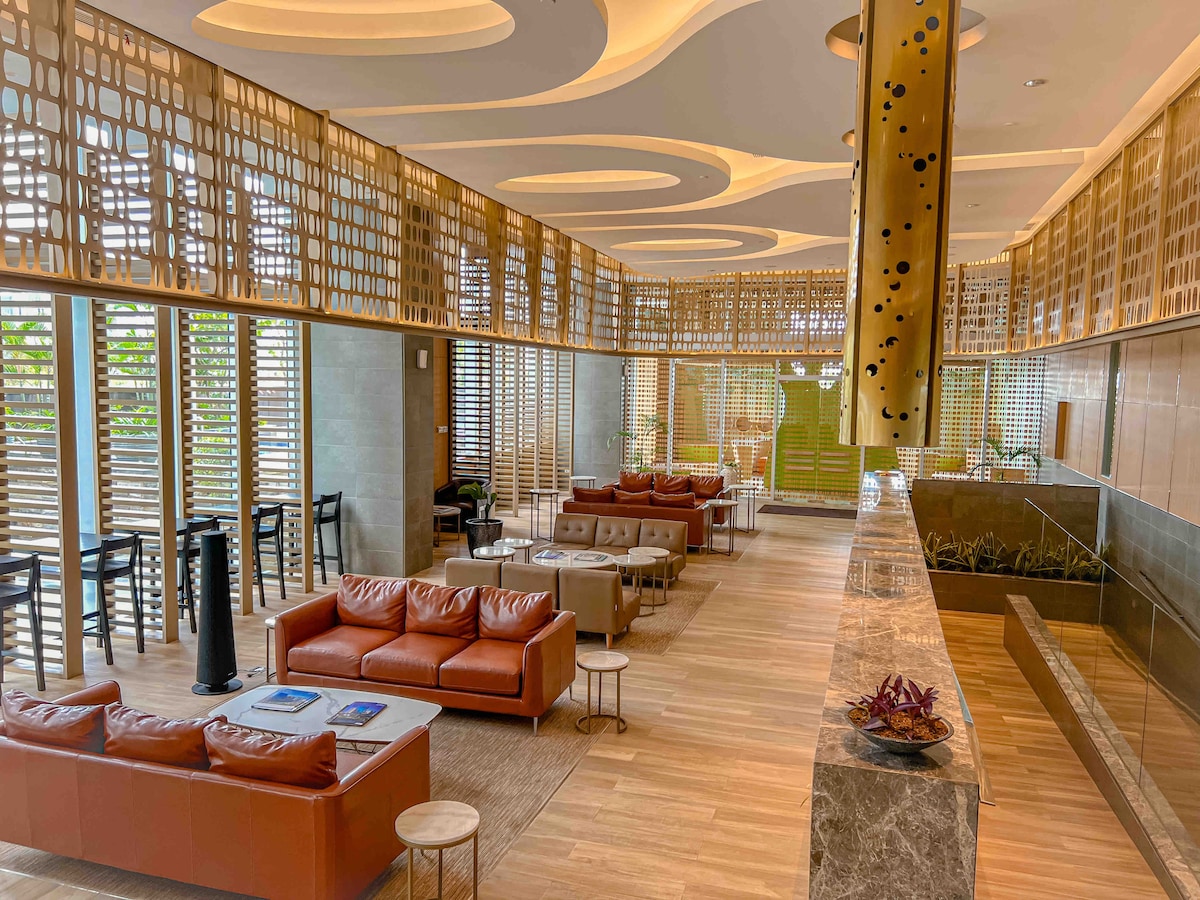 Matatagpuan sa madiskarteng lugar, malapit ka sa anumang kailangan mo, sa trabaho, paglilibang, at pagrerelaks. Kapag namalagi ka, makukuha mo ang pinakamagagandang pasilidad mula sa swimming pool, palaruan para sa mga bata, gym, at nakabitin na hardin sa ika -15 palapag. Condo 1 BR • King Size na Higaan (180x200cm) • Kuwartong may air condition na higaan • Kusina at mga kagamitan • Komportableng naka - air condition na sala na may TV • Water Heater, aparador, hanger • Kabinet ng sapatos • Mga toiletry hal., mga tuwalya, shampoo, shower gel, tissue paper na ibinigay • Smart door lock