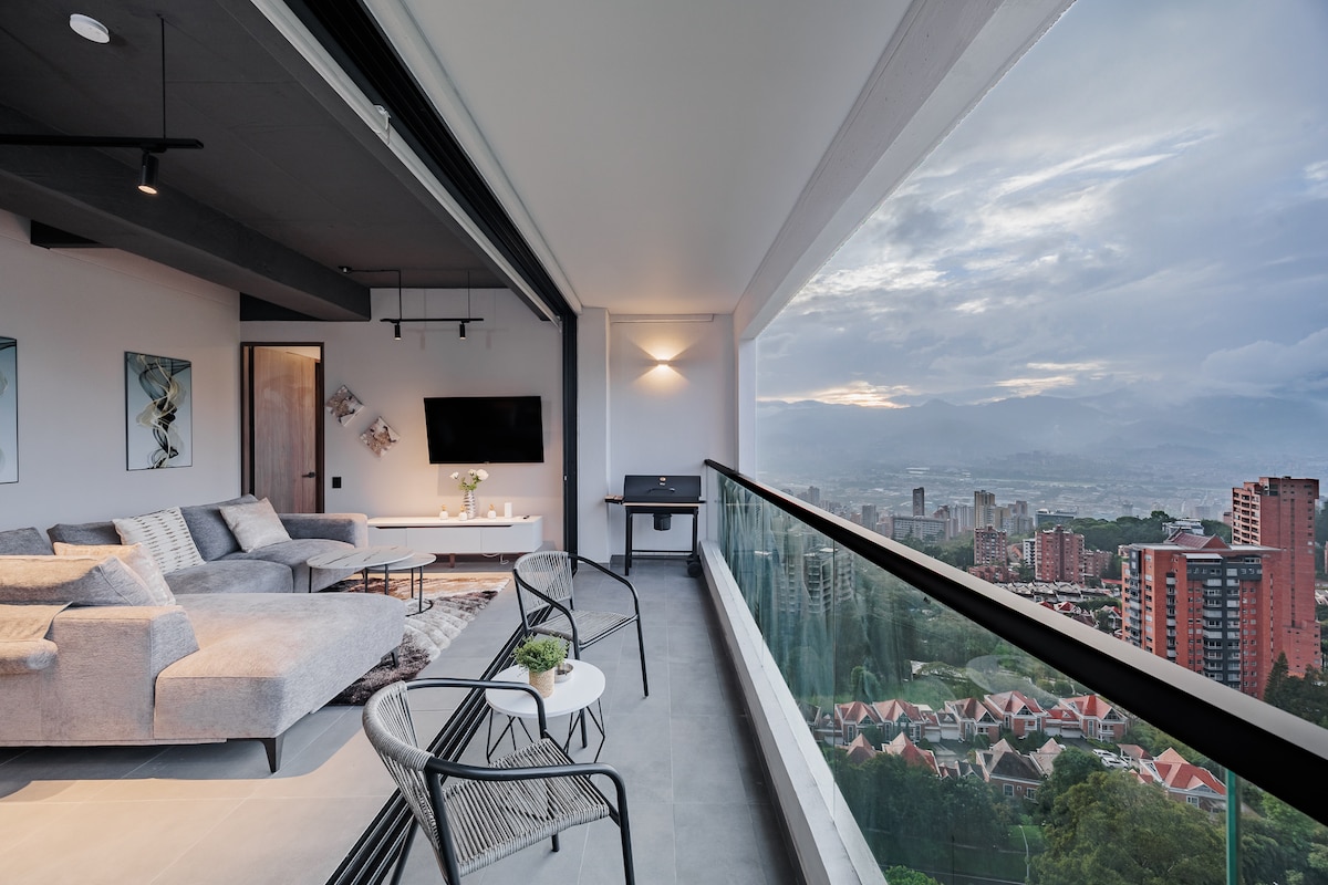 Tumakas sa marangyang 2 silid - tulugan na apartment na ito na nagtatampok ng balkonahe na malapit sa balkonahe na may mga nakamamanghang tanawin ng lambak at ilan sa mga pinakamahusay na interior design sa Medellín. Matatagpuan sa prestihiyosong gusali ng Energy Living, mag - enjoy sa mga nangungunang amenidad: isang nakamamanghang infinity rooftop pool sa ika -22 palapag, isang kumpletong gym, isang nakakarelaks na steam bath, at ang buong araw na Alquimista restaurant sa lugar. Maikling lakad lang papunta sa Carulla supermarket at isang masiglang mall na puno ng mga kaaya - ayang opsyon sa kainan!