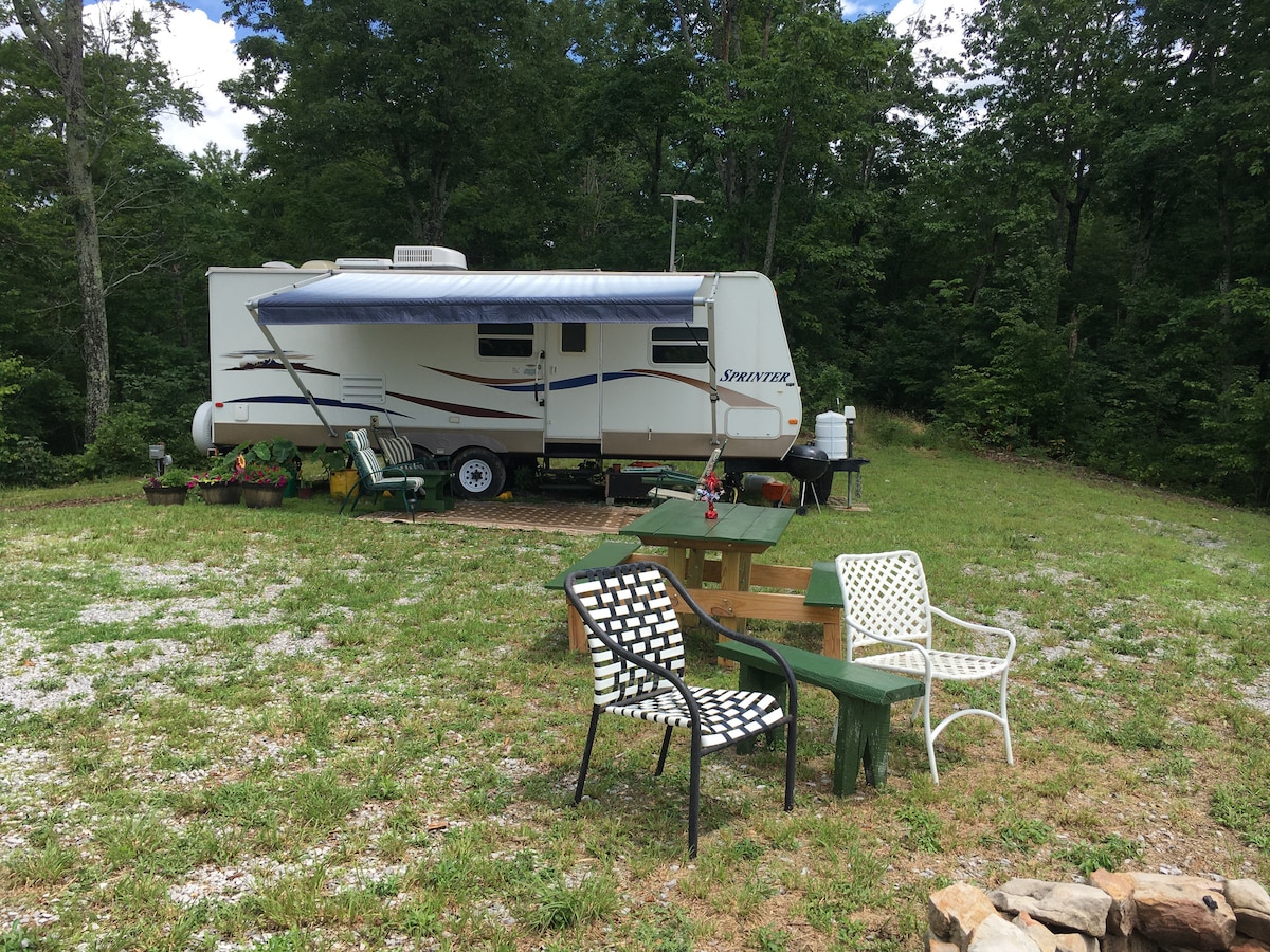 Glamping at it 's finest!!! Ang tanawin mula sa Beauty Peak Bluff ay mag - iiwan sa iyo ng humihingal. Ang lugar na ito ay may lahat ng amenidad. Matutulog nang 4 na may queen bed, double bed, at table bed kung saan puwedeng matulog ang 2 maliliit na bata. Mainit at malamig na tubig, electric service na may gas cooking, sa loob ng toilet, HVAC, TV na may DVD player, mga laro kabilang ang horseshoes, fire - pit (na may kahoy na panggatong), Weber charcoal grill. Outdoor space para sa iyong mga kaibigan na magtayo ng tent o kahit na magdala ng isa pang camper. Narito na ang mga alitaptap!