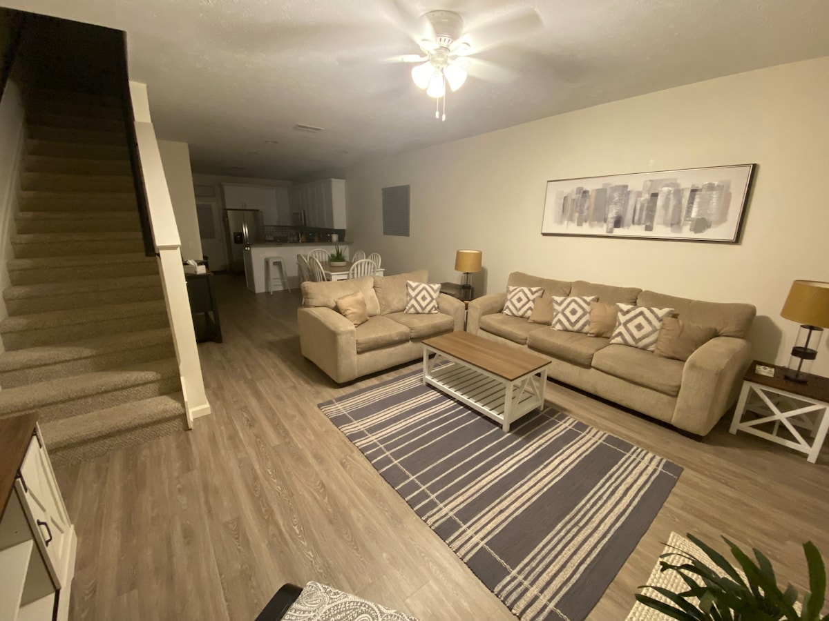 Townhouse on Mexico Beach Located on the southside of highway 98, beach side, just a 2 minute walk to the beach. Spacious 3 bedroom/2.5 bath townhouse that has been recently redecorated and many unique upgrades throughout geared towards families and entertainers. All bedrooms equipped with USB outlets. Backporch designed with 144sq ft shade, relaxing sofa, bluetooth speakers, dual fans, dining table, grill, and smart tv– Enjoy and relax outdoors year-round.