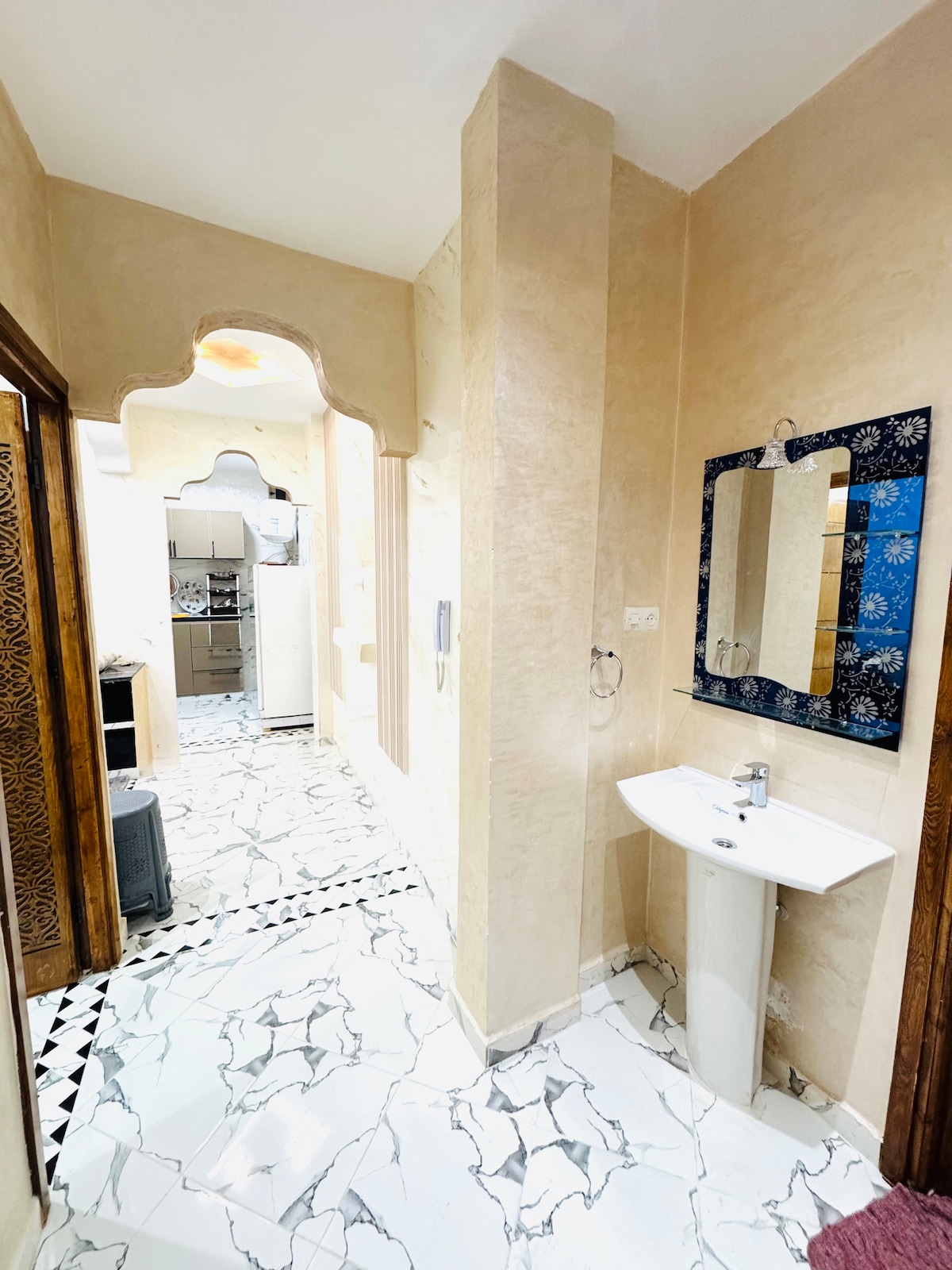 Nag-aalok ang maliwanag at maingat na pinalamutiang studio na ito ng lahat ng kailangan mo para sa isang mapayapang pamamalagi. Mayroon ditong bukas at praktikal na espasyo, kusinang kumpleto sa kagamitan, pribadong banyo, at perpektong lugar na mauupuan para makapagrelaks pagkatapos ng buong araw na paglalakbay. Nasa loob ng kapaligirang hango sa tunay na estilong Amazigh ang lahat ng ito, na may mga modernong detalye na nagpapasigla at nagpapaelegante sa lugar.