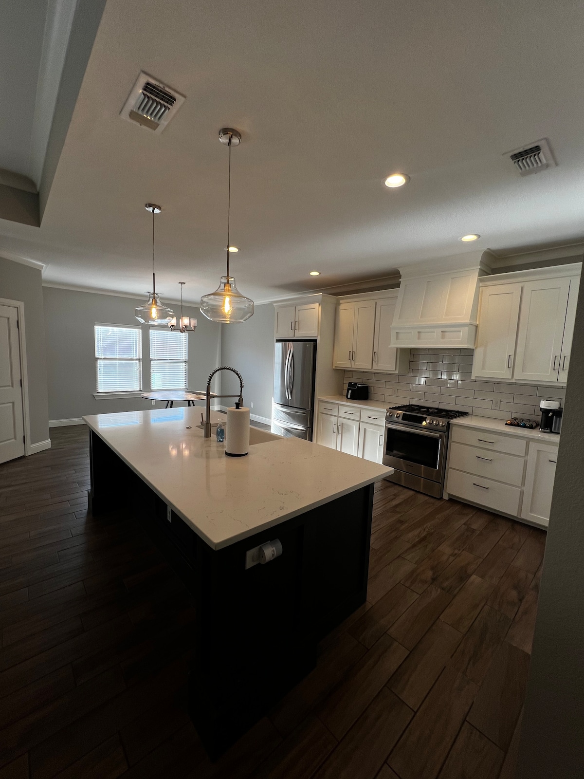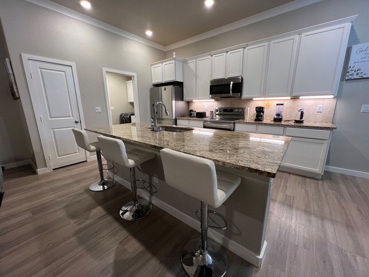 Contemporary home with plenty of spaces to rest and be entertained with any of the RokuTVs in each room. 75" TV in the living room, 65" TV in the Master and 55" TVs in each other room. Full kitchen and dining room to make yourself feel at home and cook up a delicious meal. Plenty of silverware, glassware, and kitchen utensils provided. 2 car garage. Close to Sam's, HEB market, La Mision, Fair to Midland, Osaka, Raising Cane's, Tea180, Clear Springs, Dominos, etc. Very quiet & calm neighborhood.
