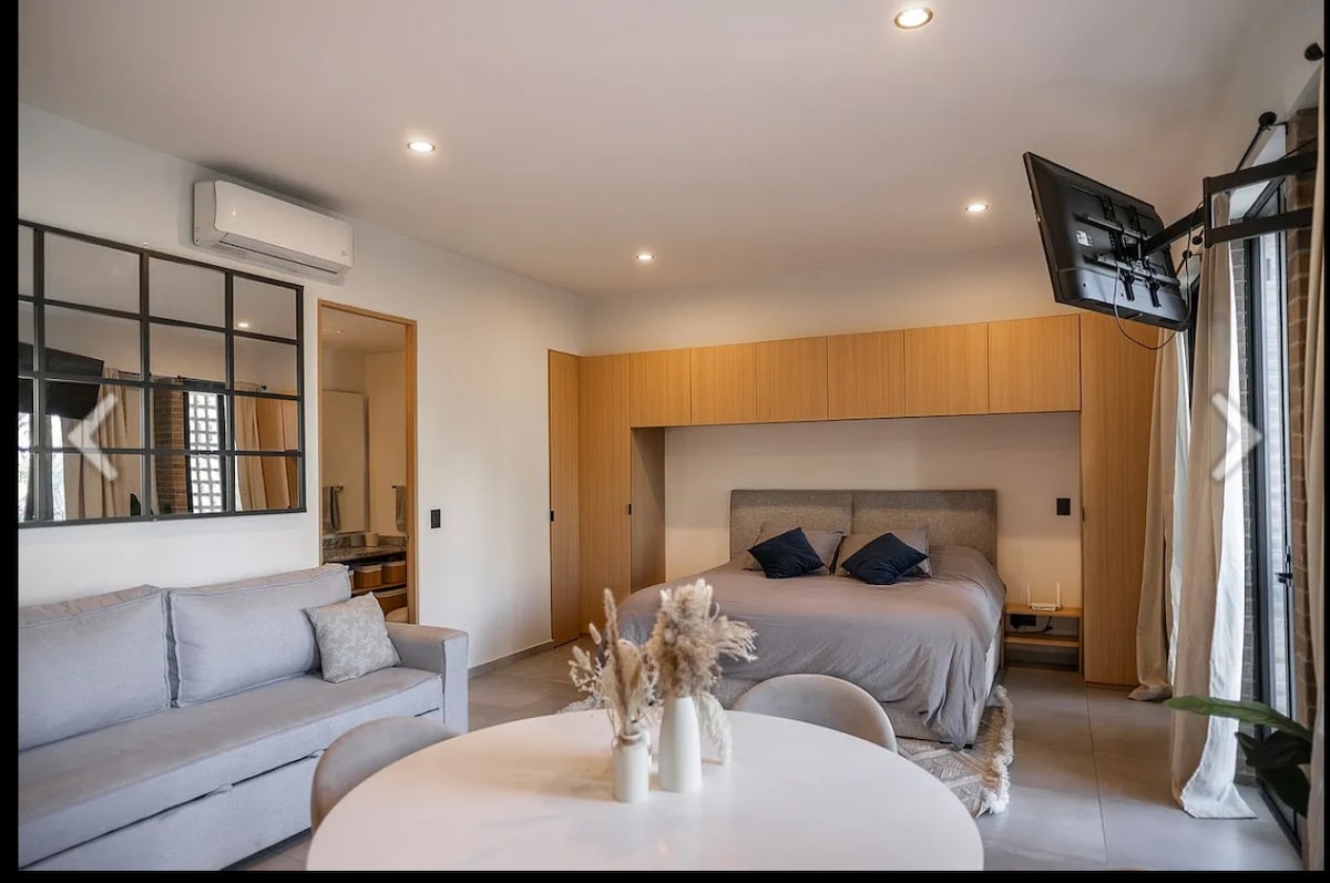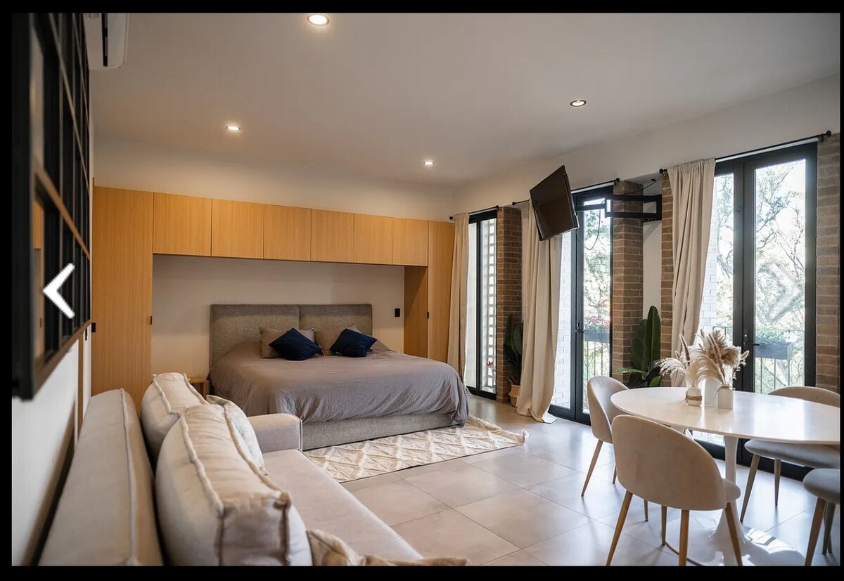 Super apartment - Studio na matatagpuan malapit lang sa MidTown. Sa lahat ng amenidad, 1 silid - tulugan, 1 buong banyo, kumpletong kusina, air conditioning ng HVAC, WiFi, garahe, garahe, terrace, labahan, 1 o 2 tao, Sa isang bahagi ng pinansyal na lugar, malapit sa Chapultepec. Mainam para sa mga business trip, maikli, mahahabang pamamalagi o sa panahong kinakailangan para bumisita sa lungsod at magkaroon ng ligtas, kaaya - aya at tahimik na lugar para magpahinga.. sa natatangi at tahimik na pambihirang bakasyunang ito.