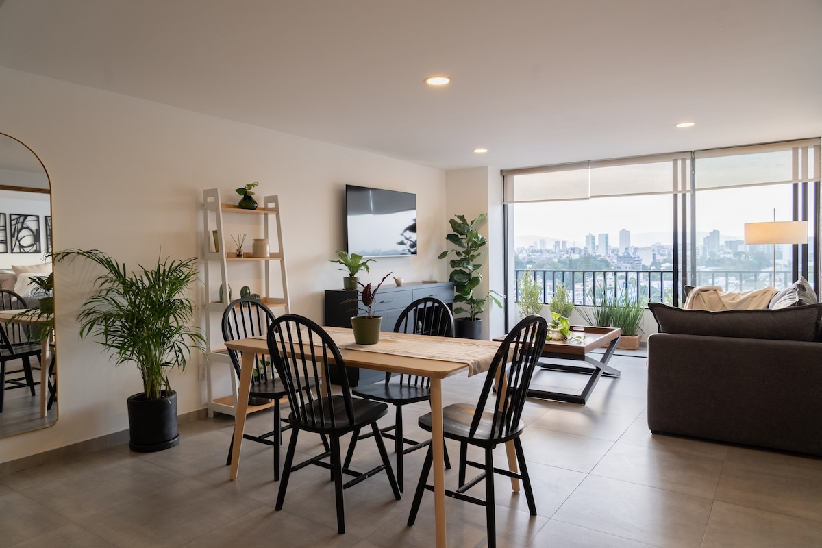 Marangyang apartment sa Guadalajara na inayusan ng tanggapan ng FNisino at may mga muwebles na gawa ng mga lokal. Mamalagi sa isa sa mga pinakaeksklusibo at pinakabagong gusali sa Providencia, malapit sa pinansyal na distrito, Bosque Colomos, at Punto São Paulo, at 10 minuto lamang ang layo sa Andares. Napakakomportableng tuluyan na mayroon ng lahat ng amenidad at magpaparamdam sa iyo na napakaganda ng pamamalagi mo. Mayroon itong 24/7 na seguridad, swimming pool, gym, coworking space, at sariling paradahan.
