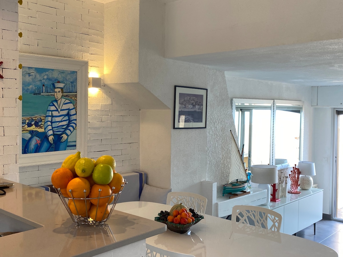 Matatagpuan sa seafront sa pagitan ng hypercenter at ng port, ang aking 30 m2 apartment ay maaaring tumanggap ng hanggang 4 na tao sa isang ligtas na tirahan. Inayos, idinisenyo ito para mag - alok sa iyo ng mainit at nakapapawing pagod na kapaligiran na may nakamamanghang tanawin ng dagat. Ang isang malaking terrace ay magbibigay - daan sa iyo upang tamasahin ang iyong mga pagkain sa labas. May parking space na nakalaan para sa iyo sa Mediterranean parking lot. Iba 't ibang tindahan ang naghihintay sa iyo sa paanan ng tirahan...