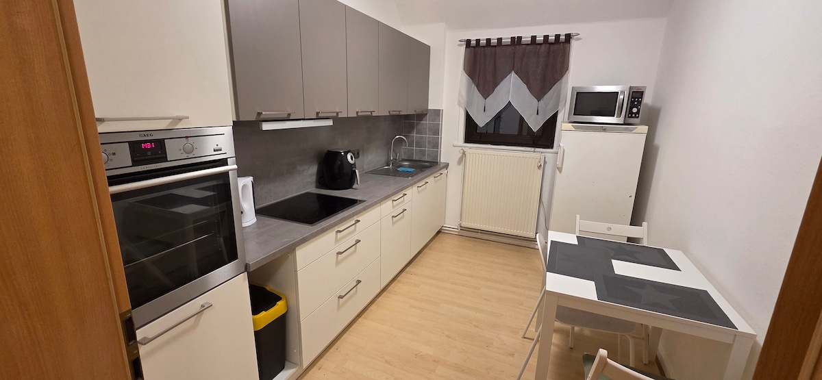 Sa aming hiwalay na bahay, nag - aalok kami ng matutuluyang may mga kagamitan. Nasa lugar mo ang maliit na kusina na inayos para sa iyo, pati na rin ang malaking banyo at balkonahe. May mga pasilidad sa pamimili, panaderya, post office, hairdresser at barbecue room sa malapit. Humigit - kumulang 350 metro ang layo ng pinakamalapit na hintuan ng bus at mapupuntahan ito sa loob ng 5 minutong lakad. Mapupuntahan ang pinakamalapit na istasyon ng tren sa loob ng 3 minuto sakay ng bus. May magandang koneksyon sa B239.